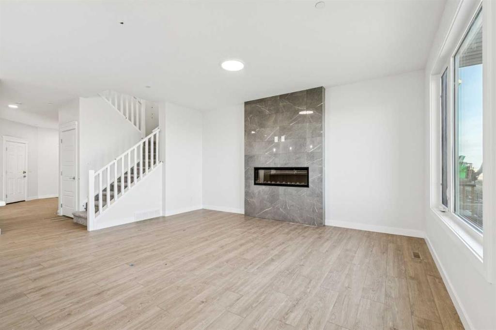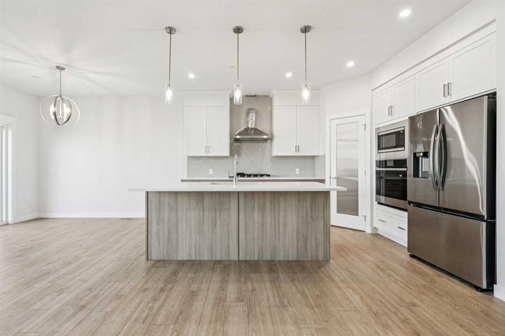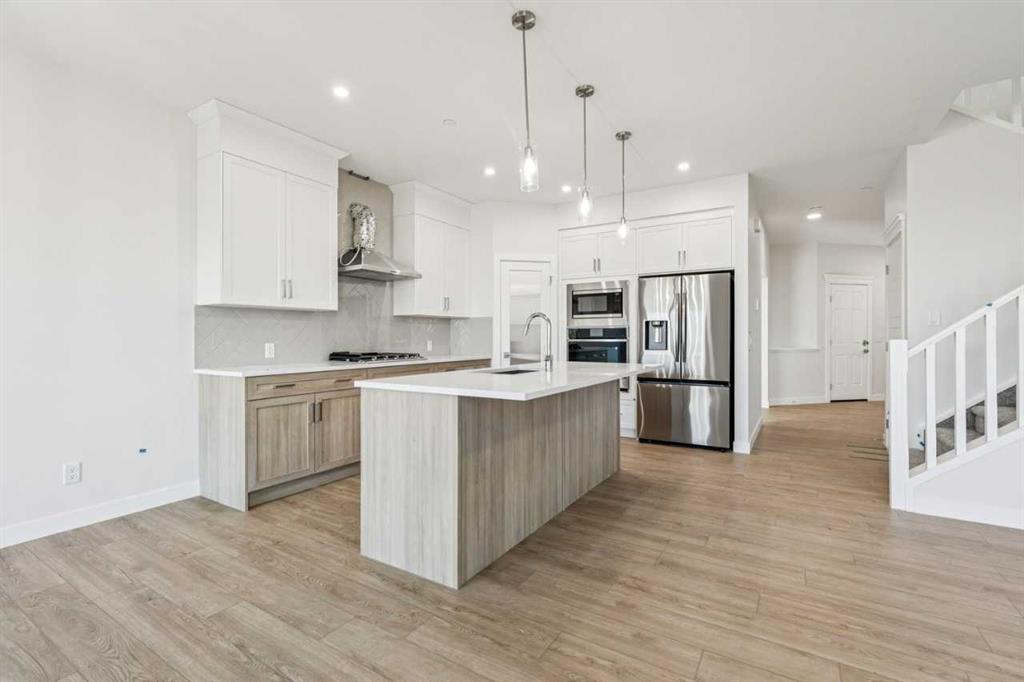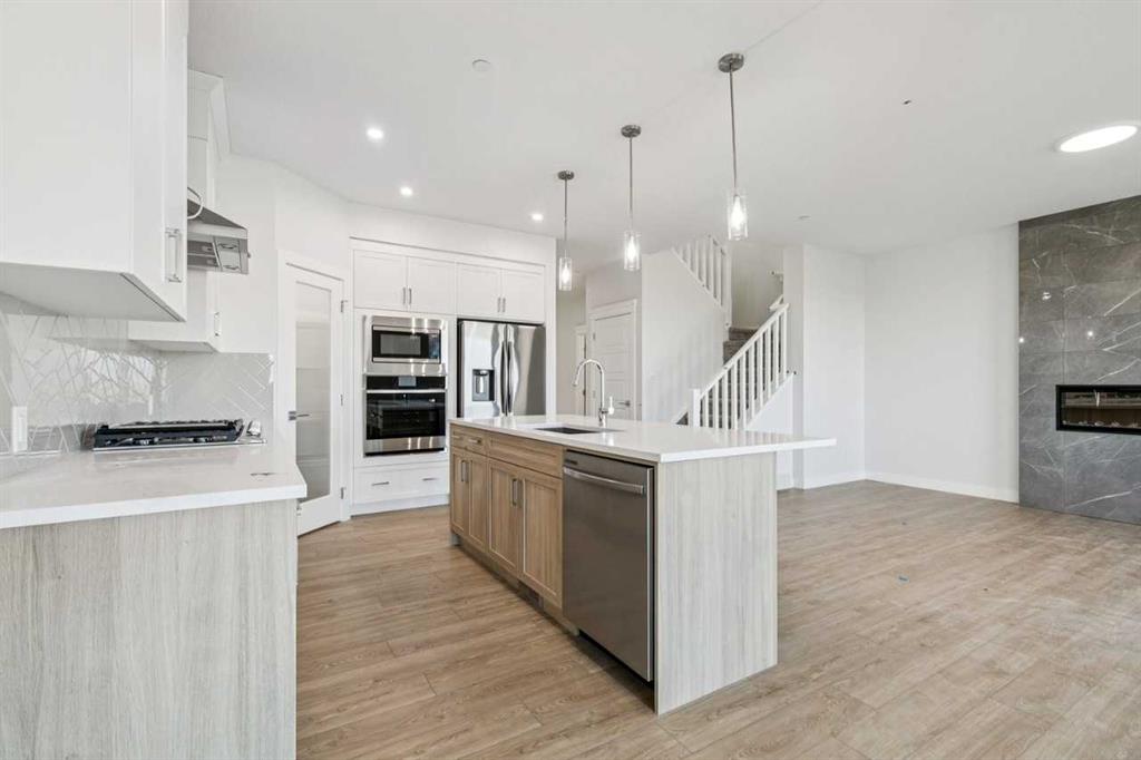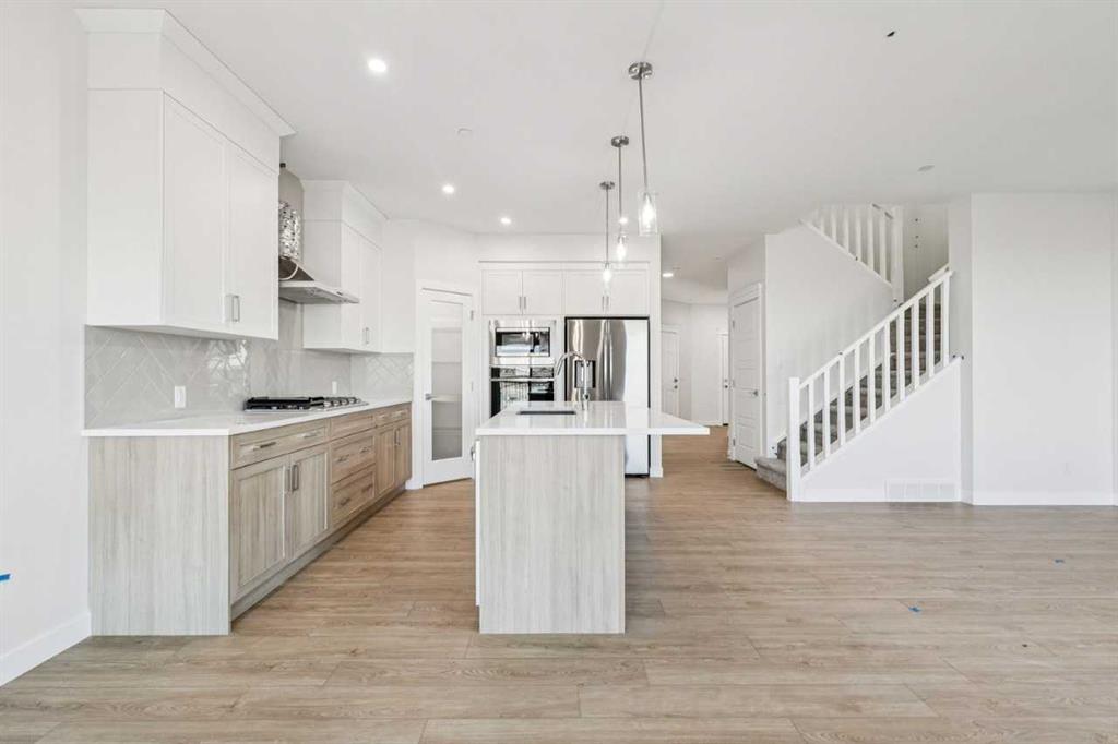 Step inside to find an open-concept floor plan filled with natural light, high ceilings, and modern finishes throughout. The spacious main floor features a large flex room suitable for a home office, and flows seamlessly into a gourmet kitchen complete with upgraded Samsung stainless steel appliances, quartz countertops, and a generous island—perfect for entertaining or casual meals.