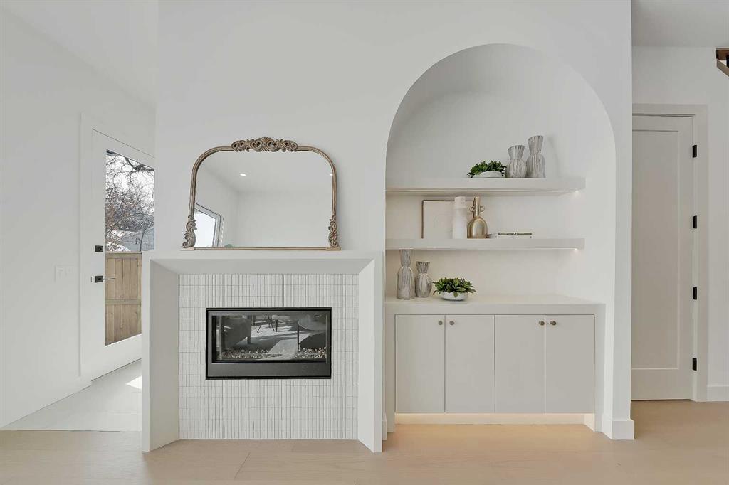 At the rear, the LIVING ROOM centres around a sleek gas fireplace with a designer tile surround. A custom built-in with a soft arched detail adds architectural character, complemented by integrated shelving and subtle lighting.