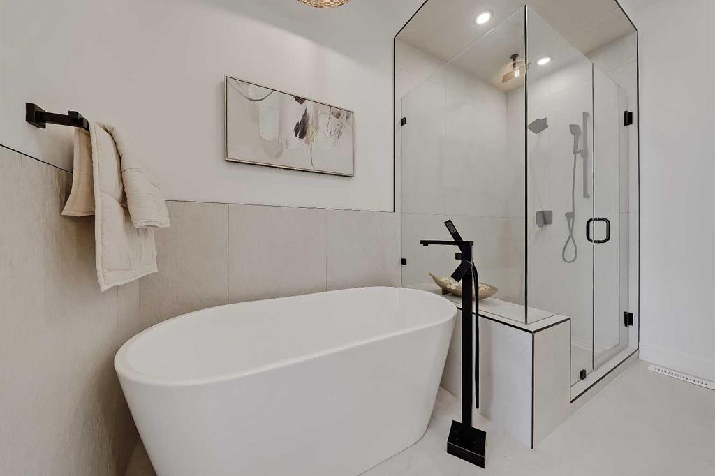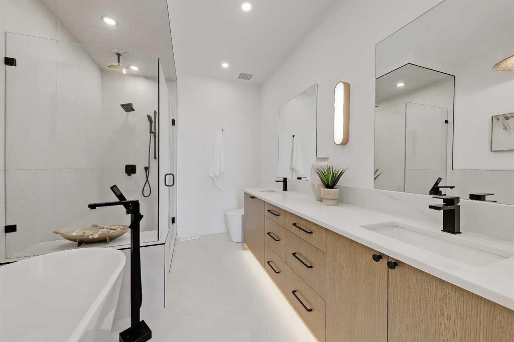 Upstairs, the PRIMARY SUITE is a true retreat with a vaulted ceiling and a generous walk-in closet with built-in organization. The spa-inspired ENSUITE features a double vanity, freestanding tub, and glass-enclosed shower with bench and dual shower heads. Designer tile and light-toned quartz create a calm, timeless feel.