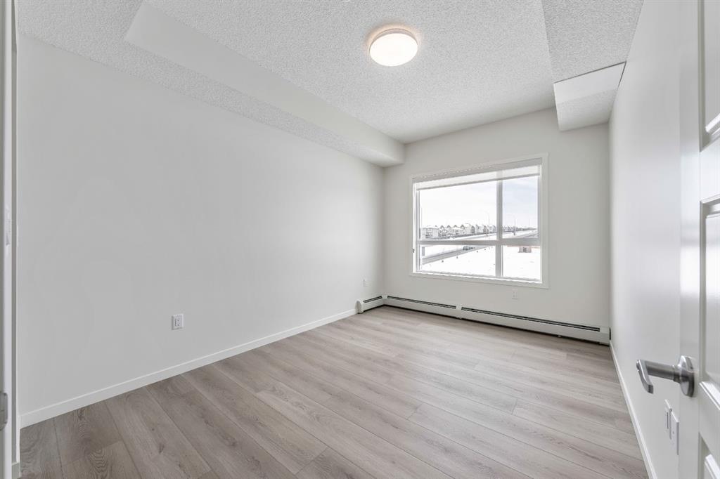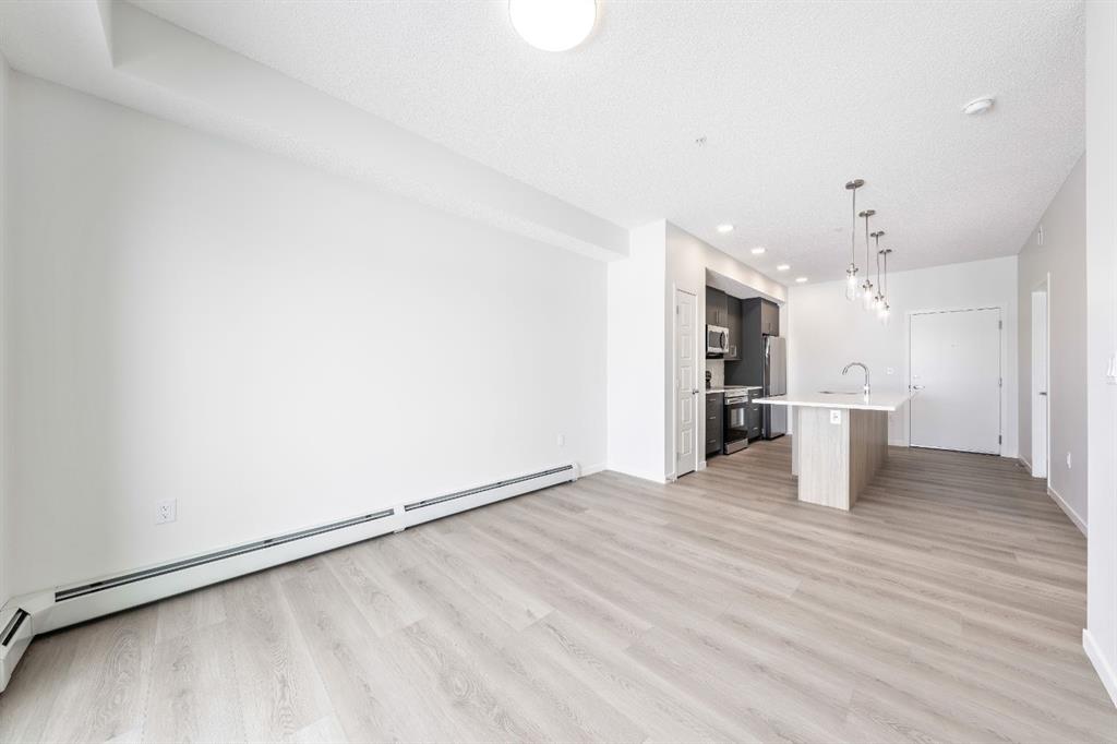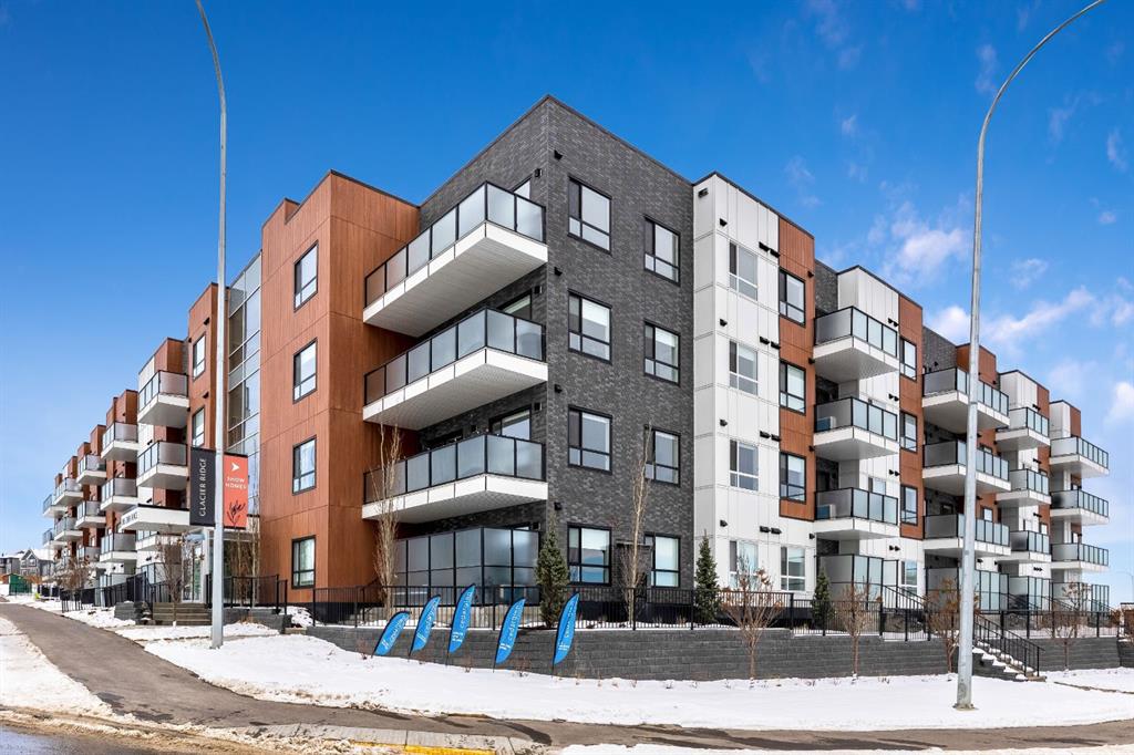Welcome to this newly build never occupied 593 sq. ft. top-floor, west-facing 1-bedroom condo in the sought after community of Glacier Ridge, built by award winning Cedarglen Living. Designed for modern living, this bright and stylish home features 9’ ceilings, luxury vinyl plank flooring throughout (no carpet), triple-pane Low-E windows, and a functional open concept layout. The contemporary kitchen offers full height two tone cabinetry, quartz countertops, stainless steel appliances, upgraded drawer package, undermount sink, and a spacious island with flush eating bar, ideal for everyday living and entertaining. Enjoy the private west-facing balcony with BBQ gas line, perfect for soaking in afternoon and evening sun. Additional upgrades include ERV fresh-air system and A/C rough in.