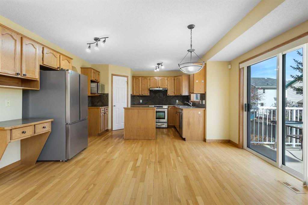 From the moment you step inside, you are greeted by a dramatic open-to-below living room with soaring ceilings and expansive windows that flood the home with natural light—creating an immediate sense of scale and openness that truly sets this property apart. The thoughtfully designed main level features brand new carpet and fresh paint throughout, enhancing the home’s clean, move-in-ready appeal. A well-appointed kitchen with stainless steel appliances, tiled backsplash, corner pantry, and central island flows seamlessly into the dining area, with patio doors leading to a large rear deck overlooking the private backyard—perfect for both everyday living and entertaining.