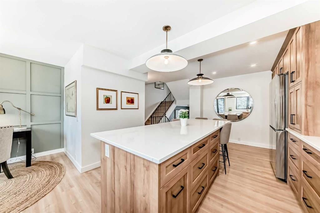 Hello, Gorgeous! Welcome to 42 Point Drive NW in the sought-after river community of Point McKay. This beautifully renovated townhome offers 1,368 sq ft of above-grade living space with 2 bedrooms and 3 bathrooms in a thoughtfully designed multi-level layout. Backing directly onto peaceful greenspace with a west-facing outdoor area, this home offers rare privacy while being just steps from the Bow River pathway system and minutes to downtown Calgary. Inside, extensive upgrades create a modern and comfortable interior, including a custom chef’s kitchen with designer drawer layout, newer appliances with induction stove, luxury vinyl flooring throughout, and stylish designer lighting. The bright living area features a tiled gas fireplace and large triple-glazed windows that bring in abundant natural light, while a sliding patio door provides seamless access to the outdoor space. Upstairs, two spacious bedrooms include a primary retreat with walk-in closet and a beautifully appointed ensuite featuring heated floors and high-end fixtures. Mechanical and infrastructure updates include all new plumbing with copper removed, triple-glazed windows and patio door, updated furnace, hot water on demand, electrical upgrades, smart thermostat, and hardwired smoke detectors. The unfinished basement provides additional storage and future potential. Additional features include an attached garage, custom built-ins, wine storage, and landscaped front garden with perennials. Located in one of Calgary’s most unique inner-city communities, this home offers easy access to river pathways, parks, Foothills Hospital, the University of Calgary, and downtown, making it an ideal opportunity for professionals, downsizers, or anyone seeking an active lifestyle close to nature and the city.