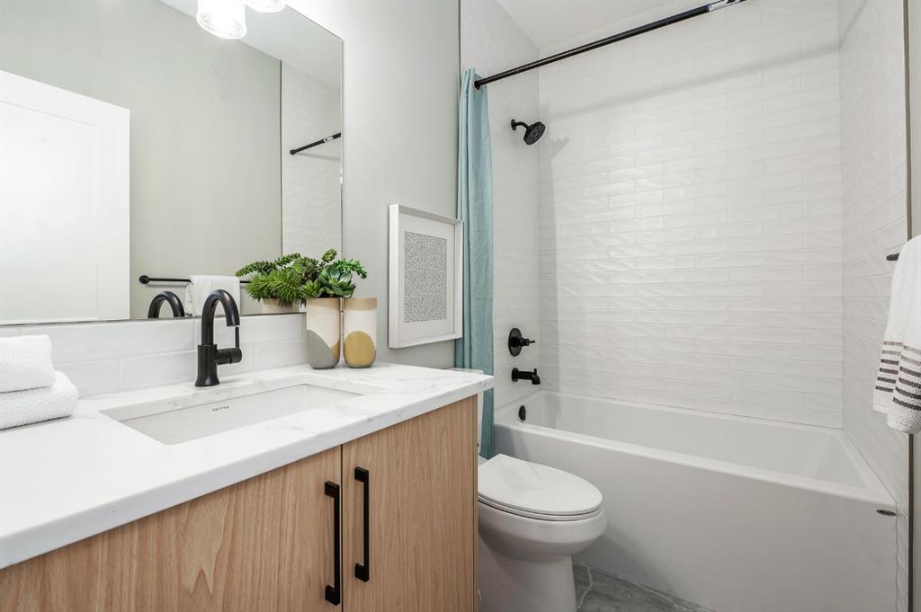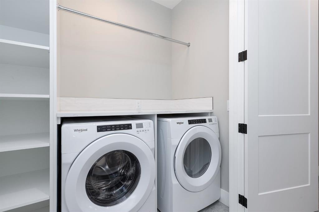 Upstairs, you’ll find two well-sized bedrooms. The primary suite is a tranquil retreat, complete with custom closet organizers and a spa-style ensuite with a double vanity and contemporary finishes. A second full bathroom with ensuite bathroom and a conveniently located laundry room complete this level.