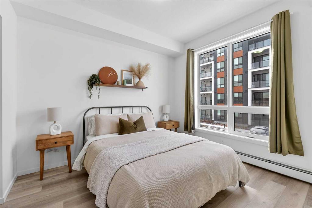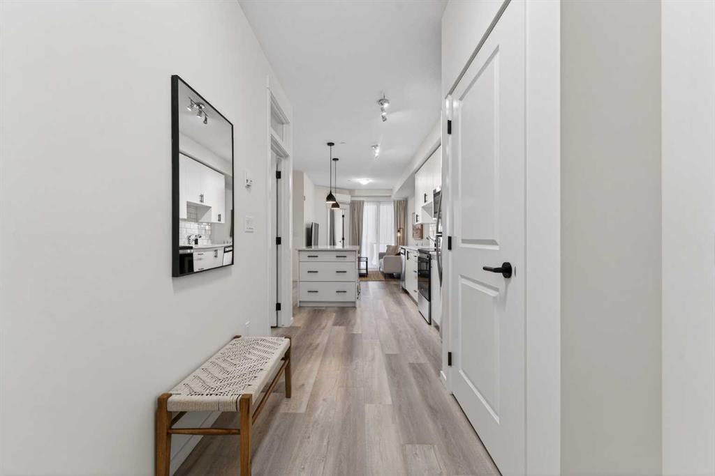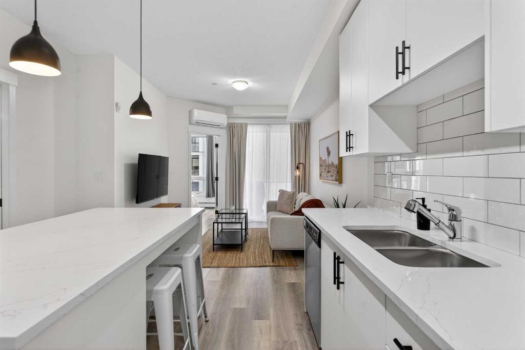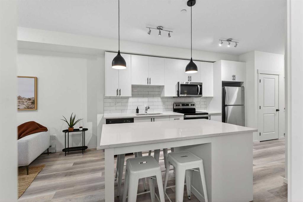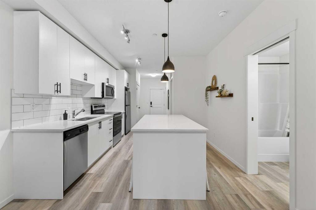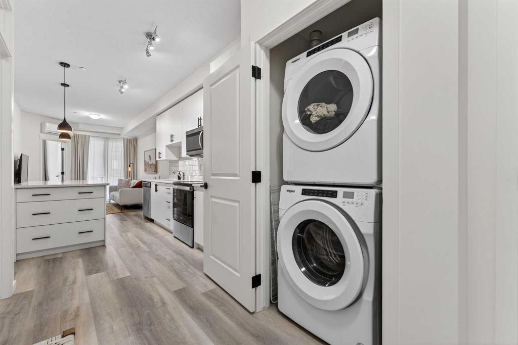 Bright, modern, and move-in ready! This immaculate 2 bedroom, 1 bathroom condo offers a fresh and stylish living space with thoughtful upgrades throughout. Featuring durable vinyl plank flooring (no carpet!), granite countertops, ceiling-height cabinetry, and a large kitchen island with built-in storage and seating for four — perfect for entertaining or casual dining. The spacious layout includes a full 5-piece bathroom with dual sinks and extra vanity storage, a walk-in closet off the primary, a large front entry closet, and a full-size stacked washer and dryer for added convenience. Stay comfortable year-round with an AC unit, and enjoy sunny afternoons & evenings on the west-facing balcony, complete with a BBQ gas line. This unit comes with a Titled parking stall and a separate storage unit, adding exceptional value and convenience. Located in the dynamic, family-friendly community of Sage Hill, you’re just minutes from abundant shopping, restaurants, scenic walking and biking paths, and have quick access to Stoney Trail and major roadways. A beautiful, low-maintenance home in pristine condition — just move in and enjoy!