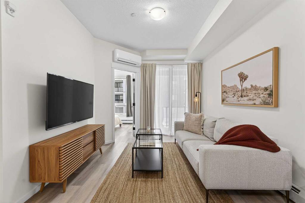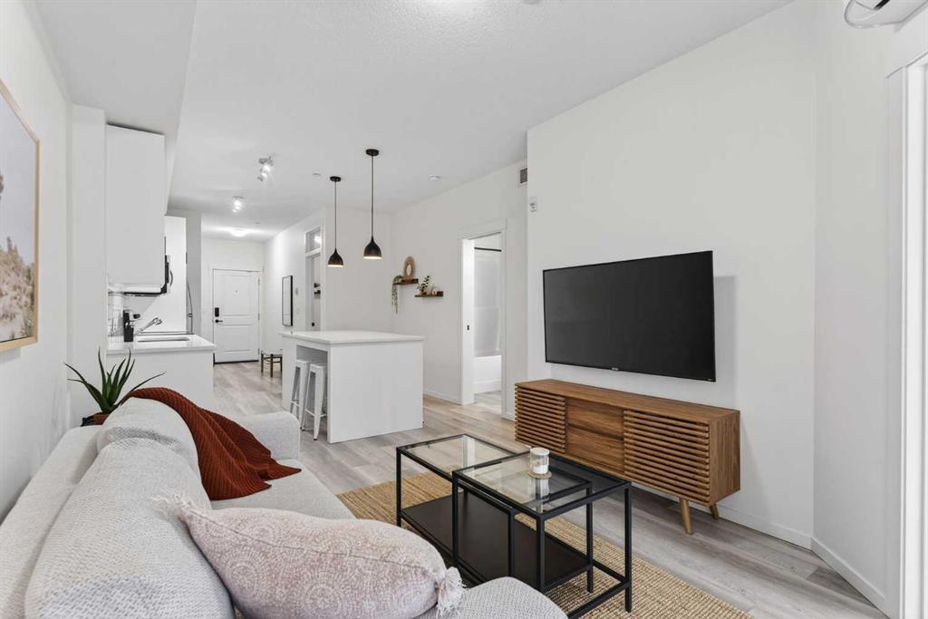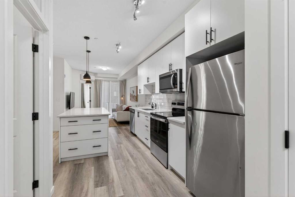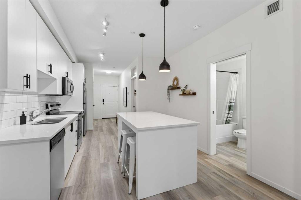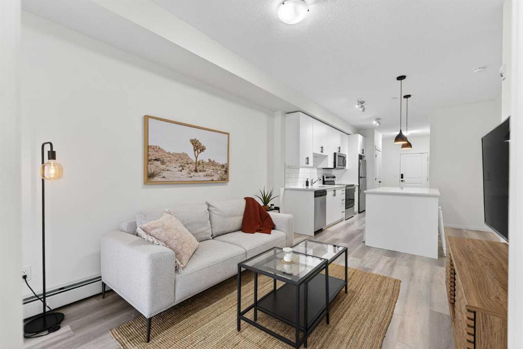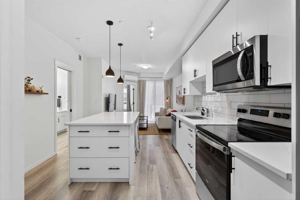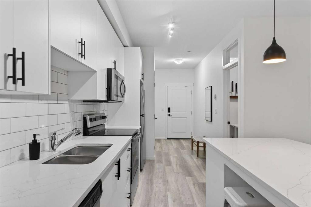 Bright, modern, and move-in ready! This immaculate 2 bedroom, 1 bathroom condo offers a fresh and stylish living space with thoughtful upgrades throughout. Featuring durable vinyl plank flooring (no carpet!), granite countertops, ceiling-height cabinetry, and a large kitchen island with built-in storage and seating for four — perfect for entertaining or casual dining. The spacious layout includes a full 5-piece bathroom with dual sinks and extra vanity storage, a walk-in closet off the primary, a large front entry closet, and a full-size stacked washer and dryer for added convenience. Stay comfortable year-round with an AC unit, and enjoy sunny afternoons & evenings on the west-facing balcony, complete with a BBQ gas line. This unit comes with a Titled parking stall and a separate storage unit, adding exceptional value and convenience. Located in the dynamic, family-friendly community of Sage Hill, you’re just minutes from abundant shopping, restaurants, scenic walking and biking paths, and have quick access to Stoney Trail and major roadways. A beautiful, low-maintenance home in pristine condition — just move in and enjoy!