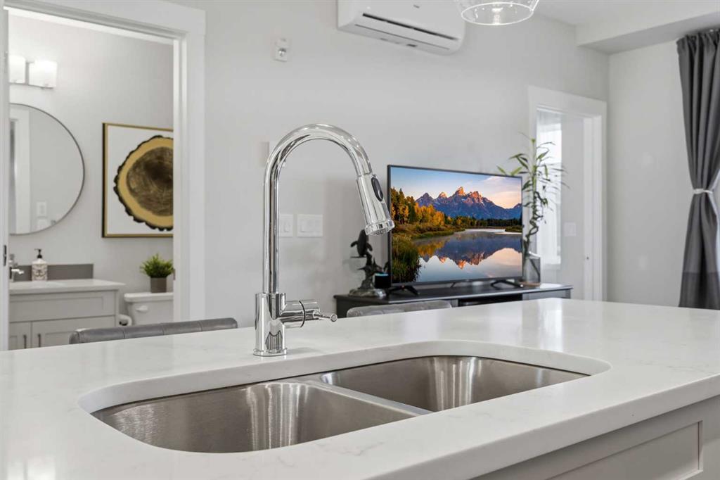 Check out the the 3D Tour of this spotless, and meticulously maintained unit! Welcome to Seton West, where lifestyle, convenience, and long-term value come together in one of Calgary’s most sought-after southeast communities, and all residents gain exclusive access to THE BLOCK, Seton’s exclusive community recreation centre. This extensively upgraded 2-bedroom, 2-bathroom condo offers refined, low-maintenance living designed for young professionals, first-time buyers, and savvy investors. From the moment you step inside, the elevated finishings set this unit apart. The kitchen is anything but standard, featuring extended quartz countertops with a waterfall-style eating bar, full-height cabinetry, tile backsplash, and a premium stainless steel appliance package.