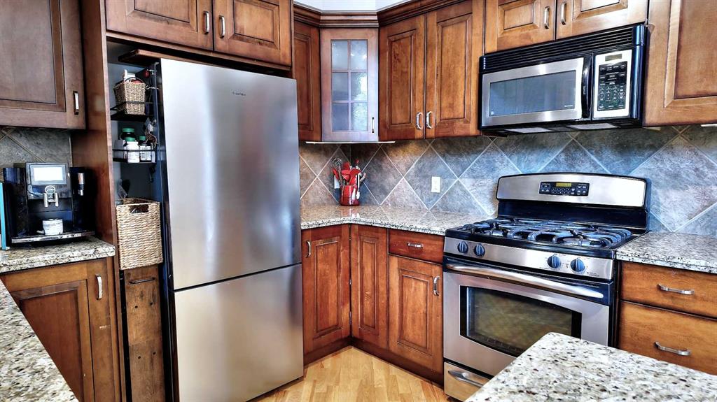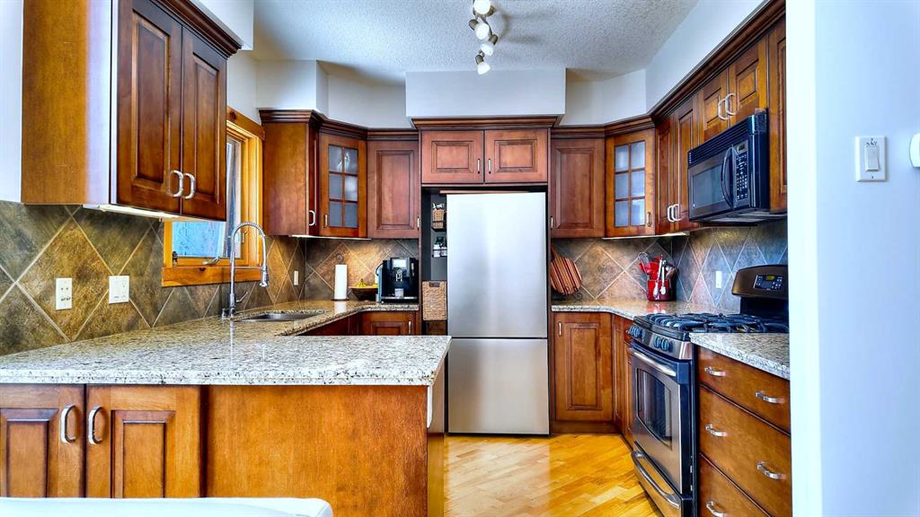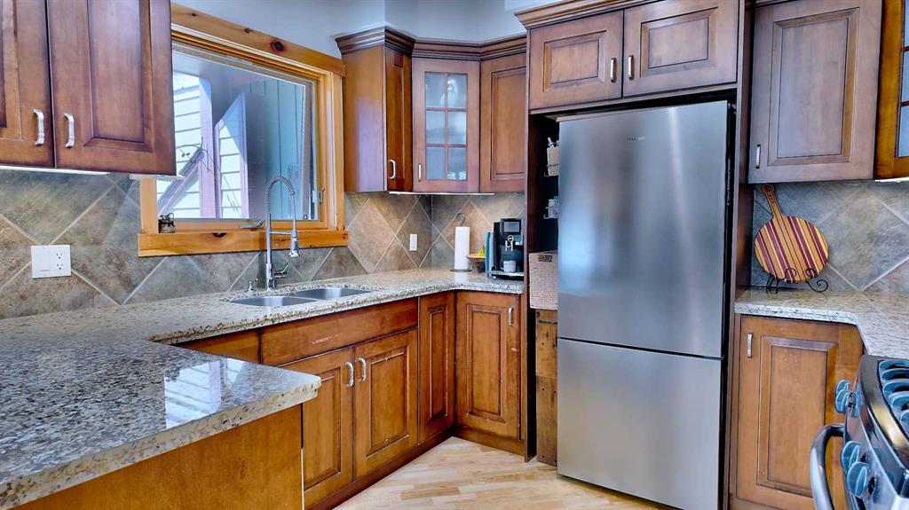 The kitchen is well equipped with granite countertops, stainless steel appliances, and a gas stove, making it both practical and inviting for everyday living or entertaining. A large deck off the living room extends the space outdoors and captures the surrounding mountain scenery. The main floor also includes one bedroom and a full 4-piece bathroom.