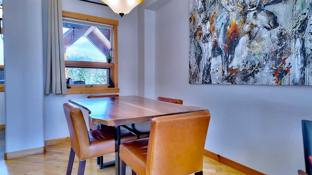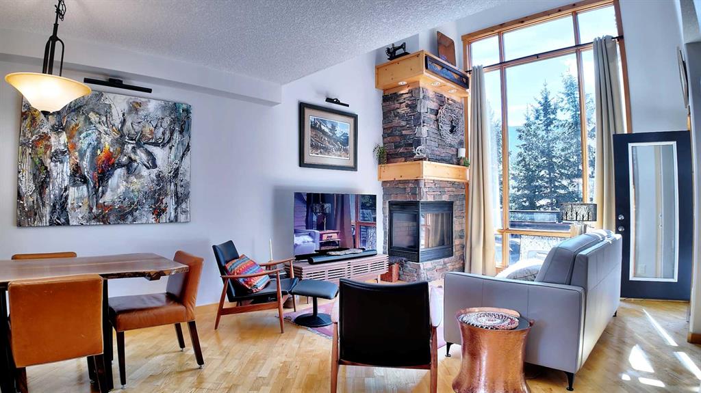 Set in The Portal at Three Sisters, this 2-bedroom, 2 full bathroom Built Green townhouse offers bright mountain living in one of Canmore’s most desirable settings. The main living space is filled with natural light from towering windows and vaulted ceilings, while the two-sided gas fireplace adds warmth and character to the open-concept living and dining area. Framed by stunning mountain views, this home blends comfort, function, and alpine style.