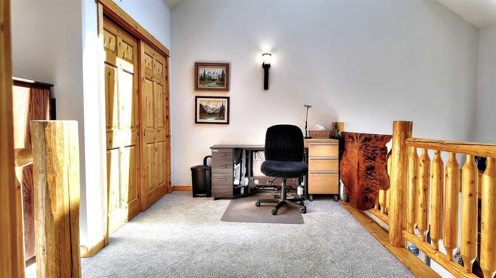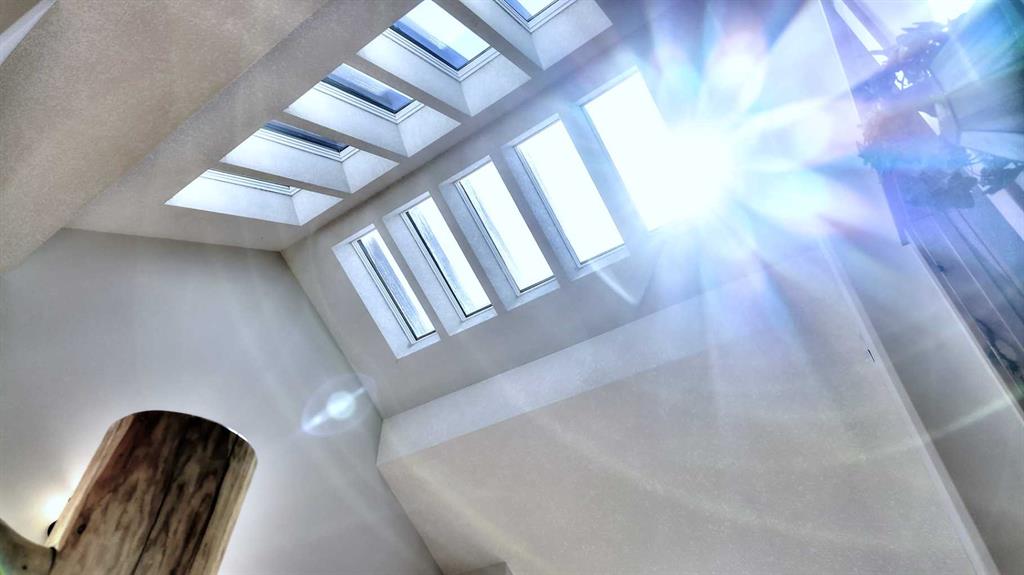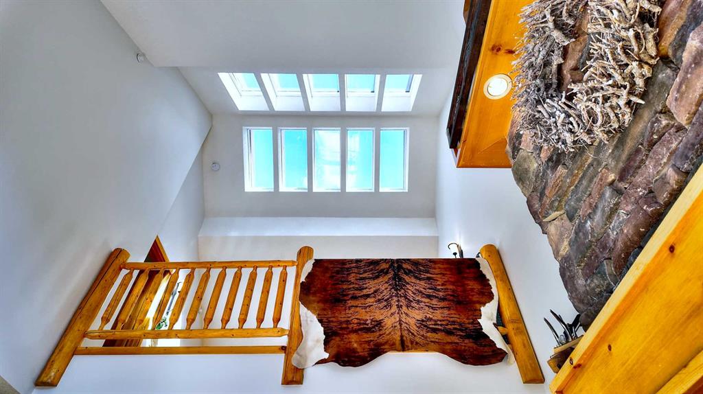 Upstairs, the open loft level is bright year-round thanks to a striking bank of skylights, creating flexible space for a home office, reading area, or additional lounge. The upper-level primary bedroom features a walk-in closet, private deck, and ensuite bathroom with upgraded ceramic tile, creating a comfortable retreat above the main living space.