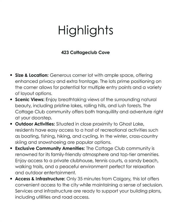 Welcome to an incredible opportunity to own a premium corner lot in the sought-after Cottage Club at Ghost Lake, Alberta. Nestled just a 35 minute drive from Calgary, this stunning location offers the perfect balance of serene lake views, outdoor adventure, and luxury living. Whether you’re looking to build your dream getaway or a full-time residence, this lot provides the ideal canvas for your vision. Property Highlights: Size & Location: Generous corner lot with ample space, offering enhanced privacy and extra frontage. The lots prime positioning on the corner allows for potential for multiple entry points and a variety of layout options. Scenic Views: Enjoy breathtaking views of the surrounding natural beauty, including pristine lakes, rolling hills, and lush forests. The Cottage Club community offers both tranquility and adventure right at your doorstep. Outdoor Activities: Situated in close proximity to Ghost Lake, residents have easy access to a host of recreational activities such as boating, fishing, hiking, and cycling. In the winter, cross-country skiing and snowshoeing are popular options. Exclusive Community Amenities: The Cottage Club community is renowned for its family-friendly atmosphere and top-tier amenities. Enjoy access to a private clubhouse, tennis courts, a sandy beach, walking trails, and a peaceful environment perfect for relaxation and outdoor entertainment. Access & Infrastructure: Only 35 minutes from Calgary, this lot offers convenient access to the city while maintaining a sense of seclusion. Services and infrastructure are ready to support your building plans, including utilities and road access. Why Cottage Club at Ghost Lake? Cottage Club is not just a location; it’s a lifestyle. Known for its welcoming community and recreational offerings, it has become one of the most desirable places to live and vacation in Alberta. Whether youre looking to enjoy a weekend retreat or settle in a peaceful, nature-filled environment, this corner lot is the ideal place to create your future. Don’t miss the opportunity to make your mark in one of Albertas most beautiful communities. Contact us today to learn more about this exceptional corner lot in Cottage Club at Ghost Lake.