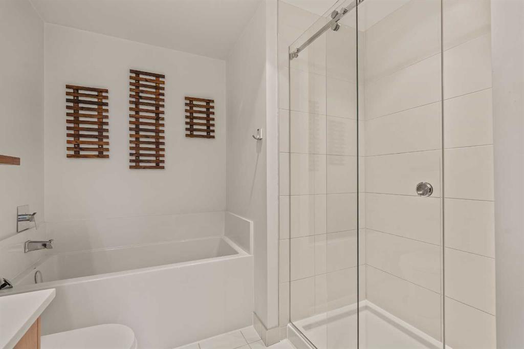The large bathroom offers both a relaxing soaker tub and a separate glass shower, with convenient access from the primary bedroom. Enjoy your own private balcony, in-suite laundry, and valuable extras including titled underground parking, a separate storage locker, secure bike storage, and ample guest parking.