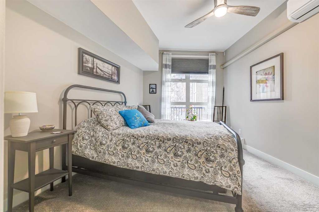 MISSION POSSIBLE! Modern, bright and effortlessly livable — welcome to your Mission retreat at Xolo. This tastefully upgraded TOP FLOOR condo blends clean, contemporary finishes with a smart, open layout. The kitchen shines with sleek cabinetry, corian counters and stainless steel appliances. The den provides study space or dedicated focus for those work from home days. This is a SPACIOUS unit! Hardwood throughout plus cozy carpet in bedroom. Quiet location in the building with only one common wall and no one above. The lovely, bright living room is perfect for entertaining or for lounging after a lively day exploring all that vibrant Mission has to offer. The unique historic character of the area is packed with a variety of dining options, diverse shopping and energetic entertainment venues. yet the relaxing allure of the Elbow River Pathway system is right at hand. Walk, bike, jog, roll out your yoga mat… enjoy nature without the drive. Plenty of upgrades in this home. Appreciate the comfort of in-suite, full-size laundry, titled parking, air conditioning, a fireplace, dual closets in the primary bedroom and an assigned storage locker. Additional updates include custom blinds, ceiling fans, newer carpet & paint, washer/dryer and thermostat. Relax on your private balcony. Or, step out to the street and become instantly immersed in the best of Mission: cafés, river pathways, the iconic 4th Street energy… and downtown is only minutes away. This is a neighborhood with unbeatable walkability. This is a condo with unbeatable charm. This is an opportunity with unbeatable possiblity! Mission possible? Mission complete!!!