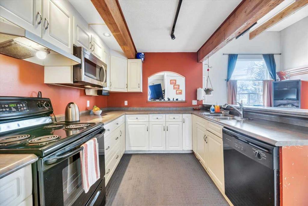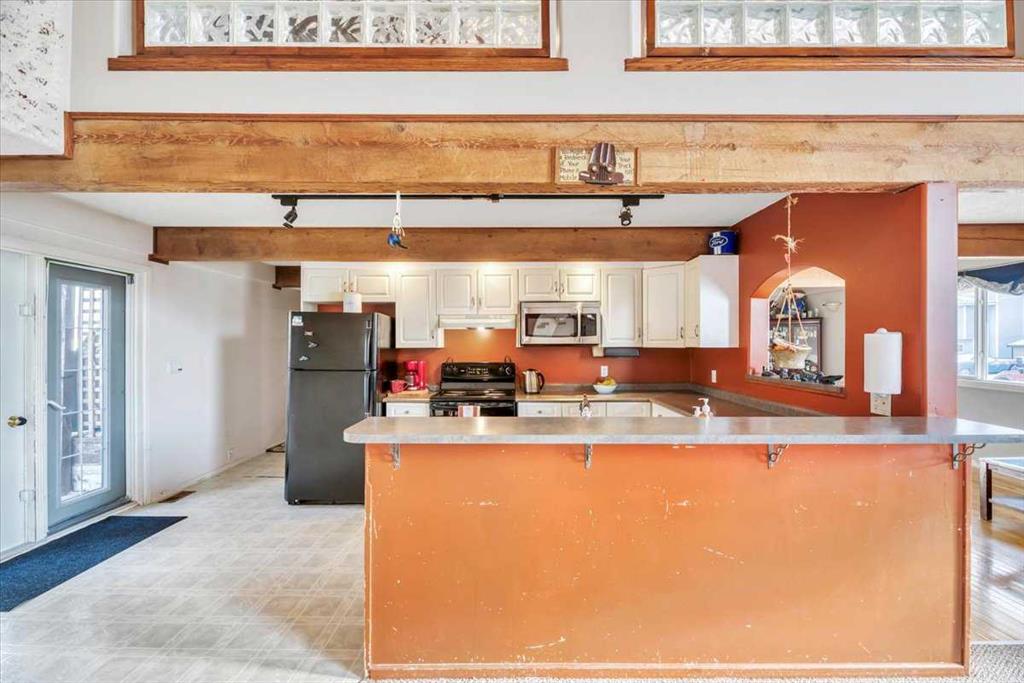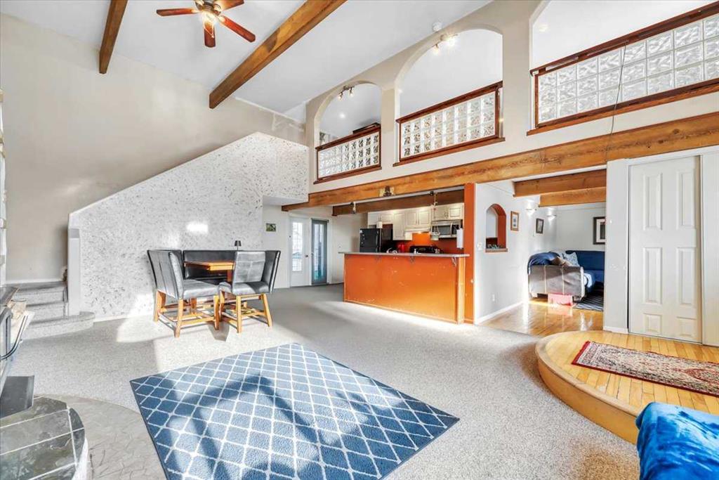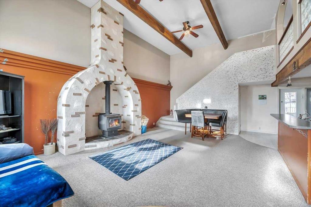 Step into the main living area and you’ll be immediately drawn to the soaring vaulted ceilings, exposed wood beams, and a striking custom wood-burning fireplace that serves as the heart of the home. The large kitchen offers generous counter space, a breakfast bar, and open sightlines to the dining and living areas, making it a great space for both everyday living and entertaining.