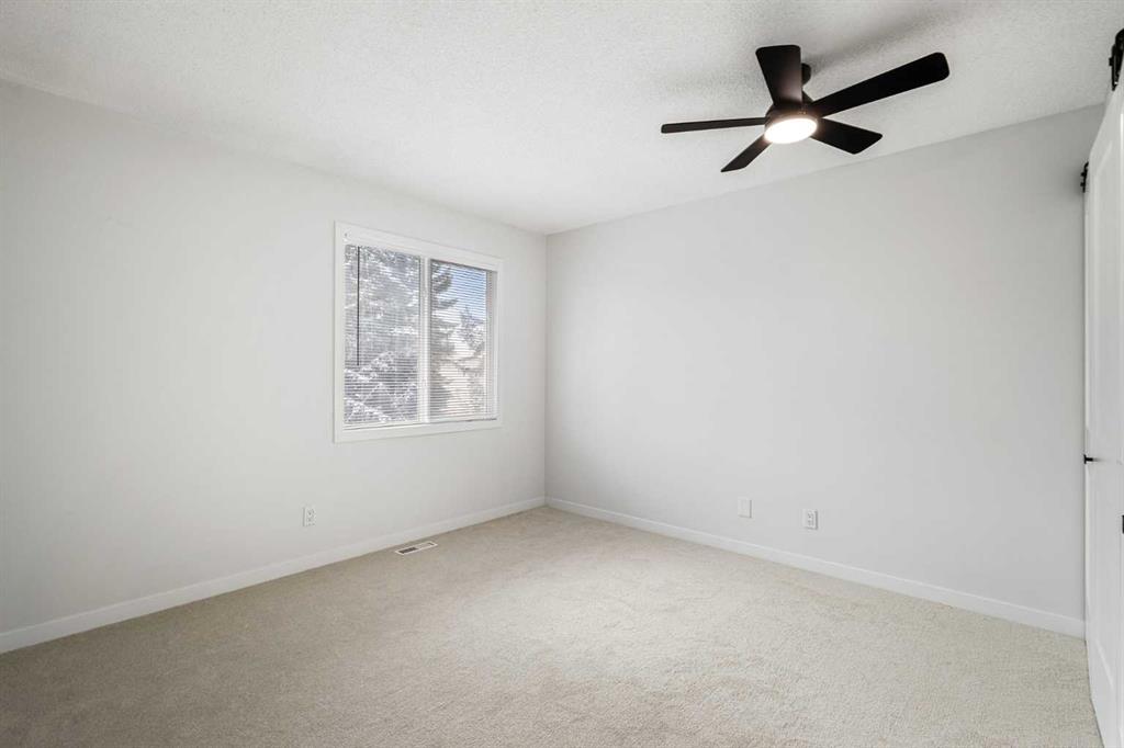 Freshly painted interiors create a bright, welcoming feel throughout. The kitchen showcases white cabinetry accented by sleek black hardware and stainless steel appliances, delivering a clean, contemporary space perfect for daily meals or entertaining. This crisp white-and-black design theme continues throughout the home, creating a cohesive, designer-inspired look with a modern edge. Custom bi-fold barn doors add a stylish, upscale touch rarely found in comparable units.