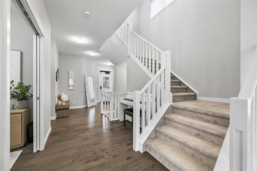Welcome to 43 Nolancrest Manor NW in the vibrant community of Nolan Hill—a perfect home for families looking for comfort, space, and a true sense of community. With over 2,500 sq ft of thoughtfully designed living space, this beautifully maintained, original-owner Trico Homes 2-storey is ready for your family to move right in. Step inside to a bright, open main floor with gleaming hardwood floors and a spacious front entry—ideal for busy mornings. The chef-inspired kitchen features a large island, quartz countertops, sleek white cabinetry, stainless steel appliances, and a walk-through pantry for easy grocery drop-offs. The sunny dining area opens to a southwest-facing deck, while the living room with a cozy gas fireplace sets the stage for family gatherings. A versatile den with dual sliding doors makes the perfect home office or homework space room, and powder room plus a mudroom complete this functional main level. Upstairs, the primary suite is a true retreat, with dual doors, a generous walk-in closet, and a spa-like ensuite featuring dual sinks, a soaker tub, and an oversized glass shower. Two more spacious bedrooms, a central bonus room (perfect for family hangouts or a kids’ playroom), upper-level laundry with extra storage, and a full 4-piece bathroom provide comfort and convenience for the whole family. The unfinished basement offers endless possibilities—whether you dream of a rec room, home gym, or teen space. Outside, the fenced southwest backyard is made for family fun: a deck and stone patio with fire pit, plenty of play space for kids and pets, raised garden beds, and direct access to green space and pathways. Also, there is direct access to the playground from the backyard! Upgrades include central A/C, water softener, central vacuum, gemstone lighting, plus newer siding and shingles for peace of mind. Located on a quiet street in Nolan Hill, your family will love being close to parks, pathways, shopping such as T&T, Walmart, Shopper’s Drug Mart, Costco, Sobey’s, Co-op, YMCA is 15 minutes away. Transit, and future schools—including a new Catholic K–9 School breaking ground soon. This is more than just a house—it’s a place your family can call home.