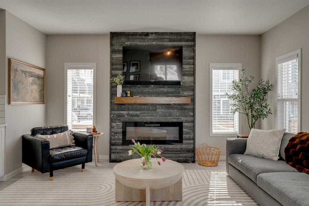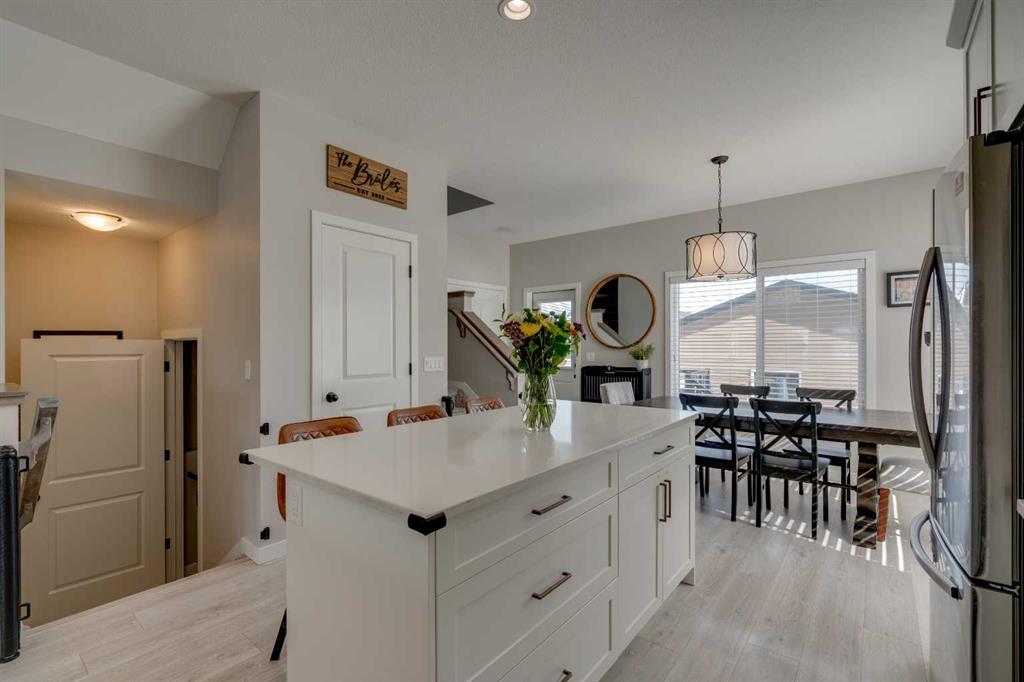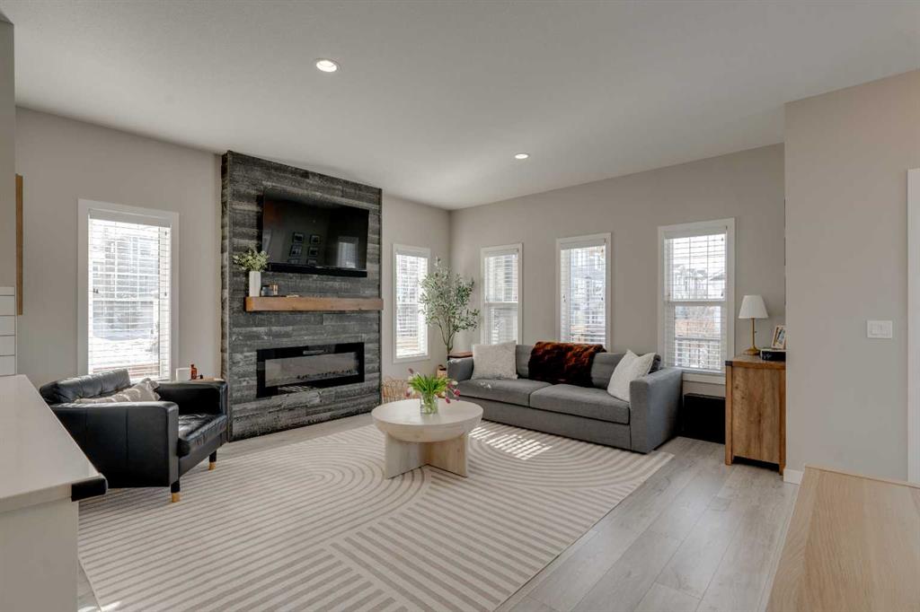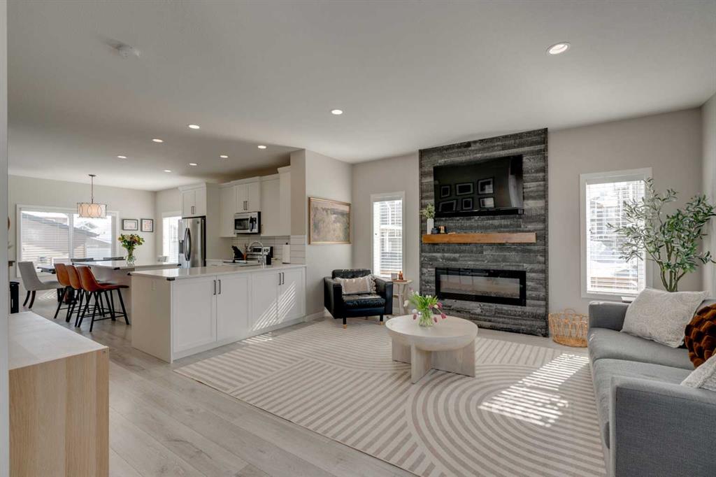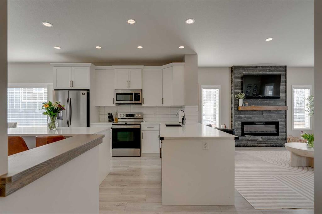 Inside, the bright and open main floor is designed for connection and comfort, featuring beautiful laminate flooring and large windows that fill the space with natural light. The inviting living room centers around a striking fireplace feature wall, while the spacious kitchen showcases crisp white cabinetry, stone countertops, tile backsplash, stainless steel appliances, and a large island with seating, making meal prep and entertaining effortless. The adjoining dining area overlooks the backyard and opens to the rear deck, perfect for summer BBQs or relaxing evenings outdoors.