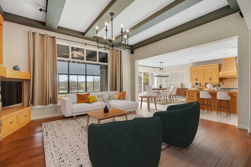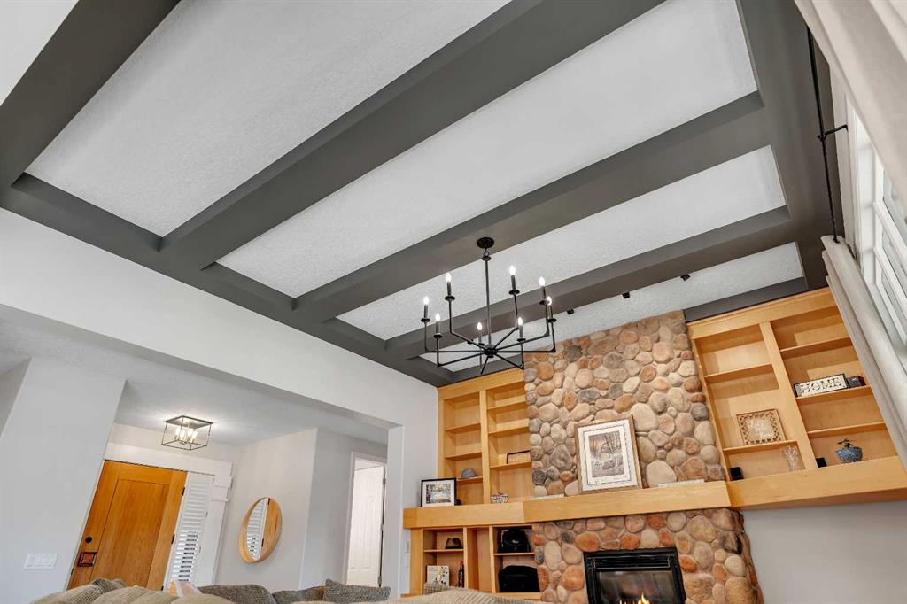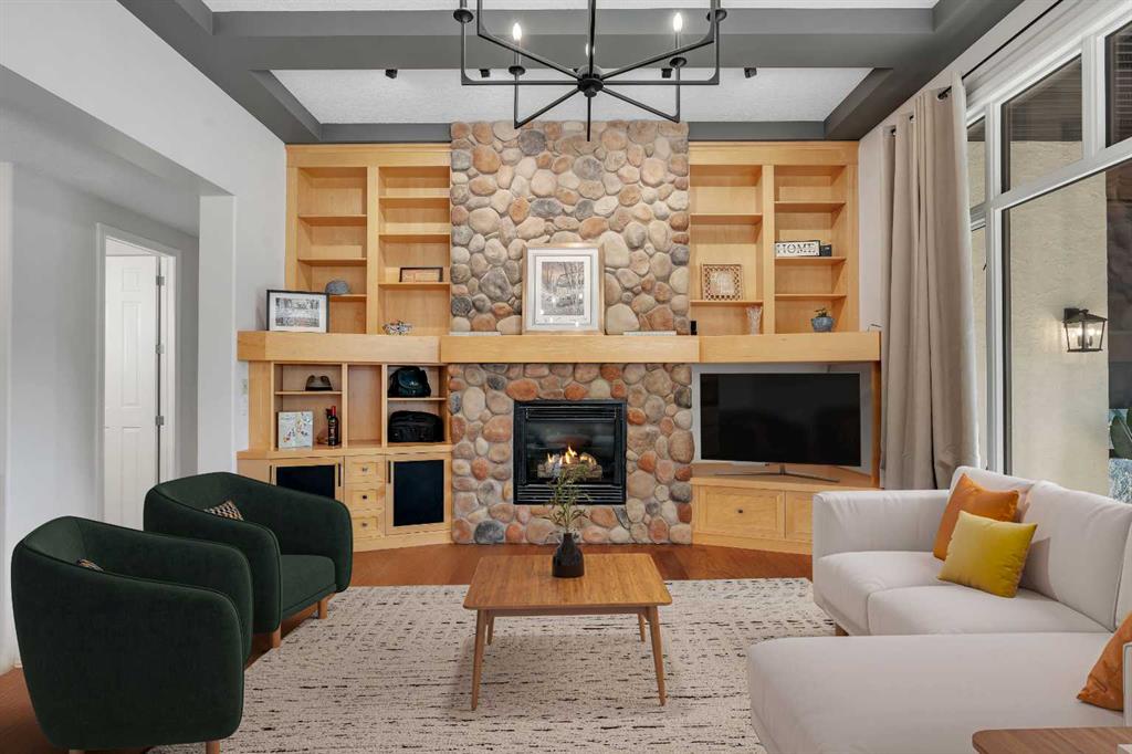 The open concept main floor is designed for both comfort and entertaining. Soaring ceilings, rich hardwood flooring and expansive windows flood the space with natural light. A striking river rock fireplace serves as the living room’s focal point, framed by custom built in shelving for both function and style.