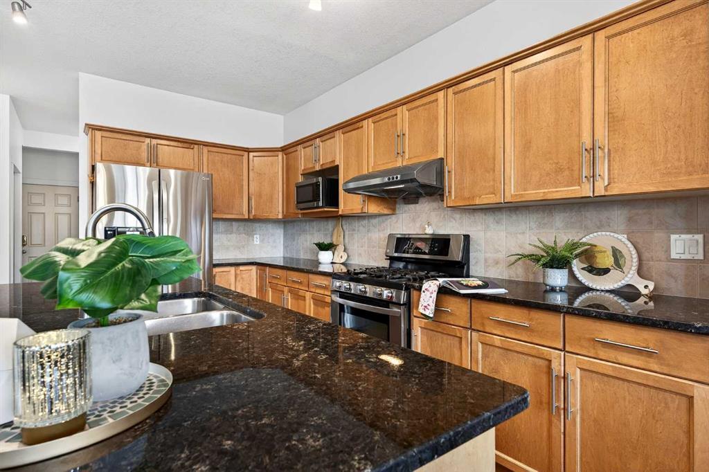 The kitchen is well-equipped with granite countertops, a gas range, and pantry, making it suitable for both daily use and entertaining. Upstairs, the primary bedroom is set apart with double-door entry and a 5-piece ensuite. A large bonus room at the front of the home works well as a media or play area, complemented by two additional bedrooms and an upper-level laundry closet.
