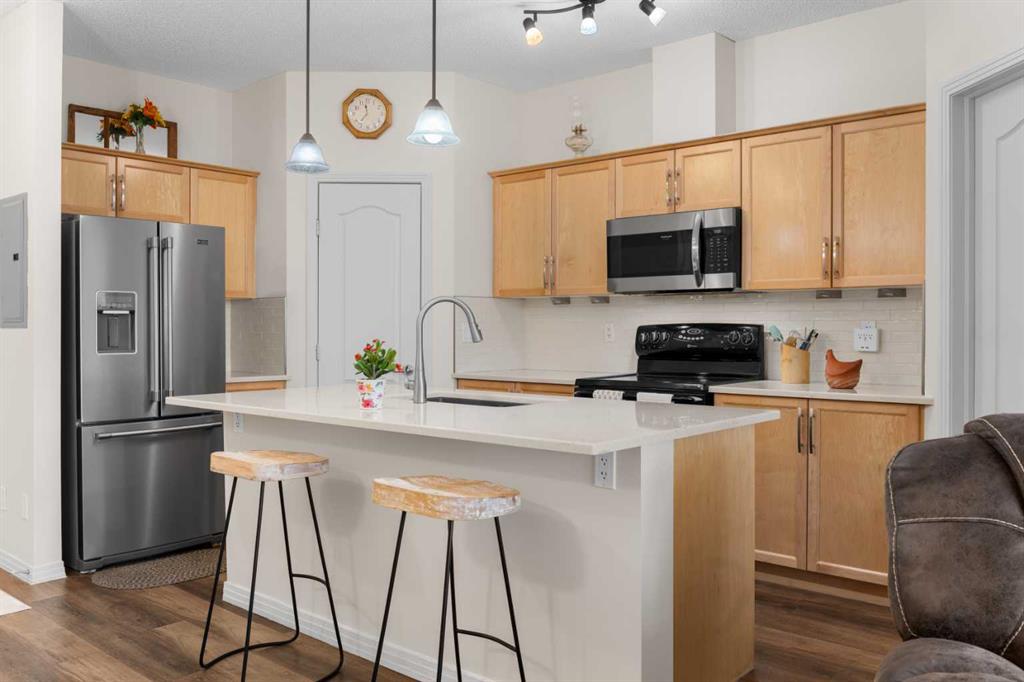 Upon entry, you’ll appreciate the modern luxury vinyl plank flooring and impressive 9-foot ceilings that enhance the bright, open feel of the space. The thoughtfully updated kitchen features a large island with quartz countertops, maple cabinetry, and a corner pantry—perfect for both everyday living and entertaining. Stainless steel appliances, including the refrigerator, microwave, and dishwasher, were updated in 2022, along with the stacked washer and dryer, conveniently located in the second bathroom.