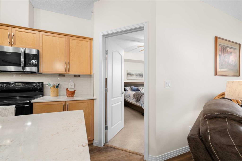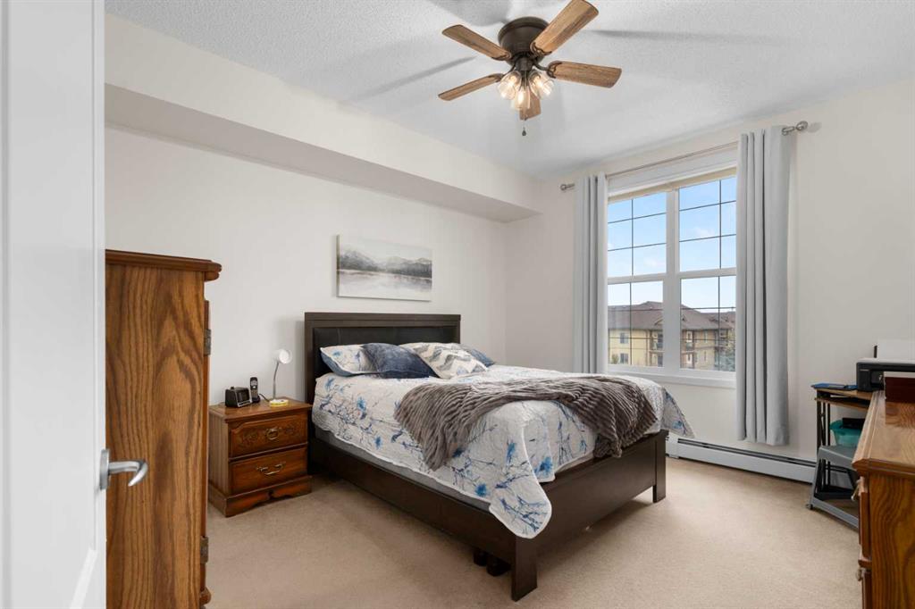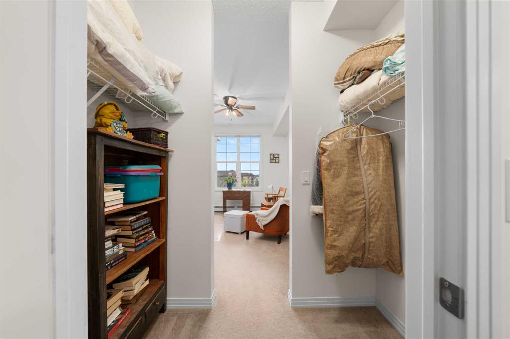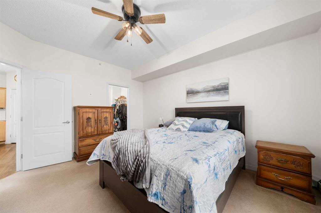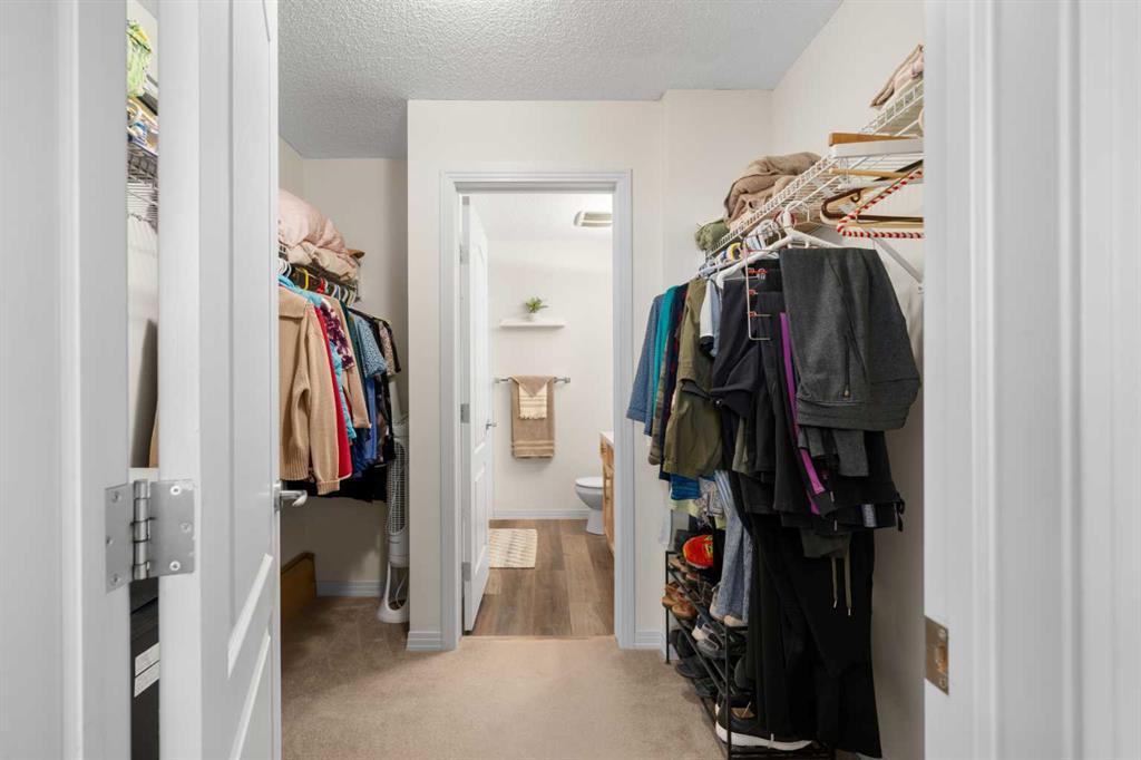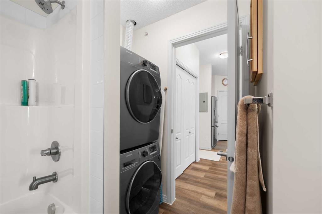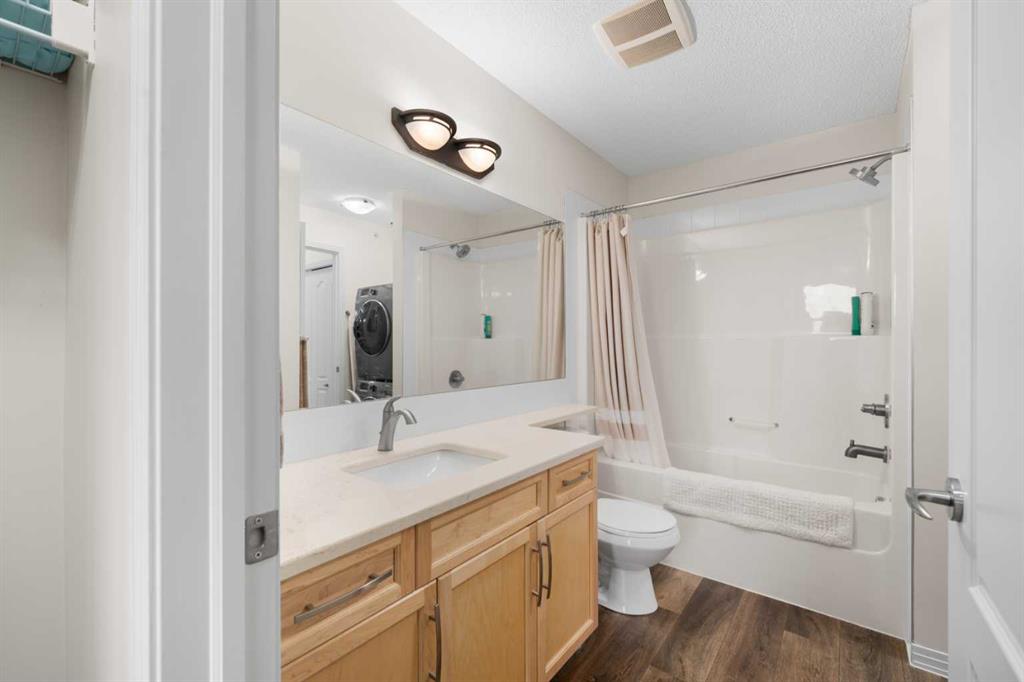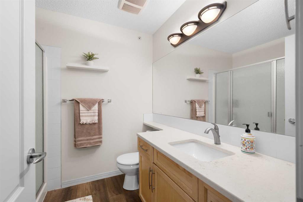 This well-designed unit offers two generous bedrooms. The second bedroom features a walkthrough closet and convenient access to a 4-piece bathroom with quartz counters, a large vanity, updated flooring, and the in-suite stacked laundry for added convenience. The primary suite is a true retreat, complete with a large walkthrough closet and a private ensuite featuring luxury vinyl plank flooring, a spacious shower, and a quartz-topped vanity.