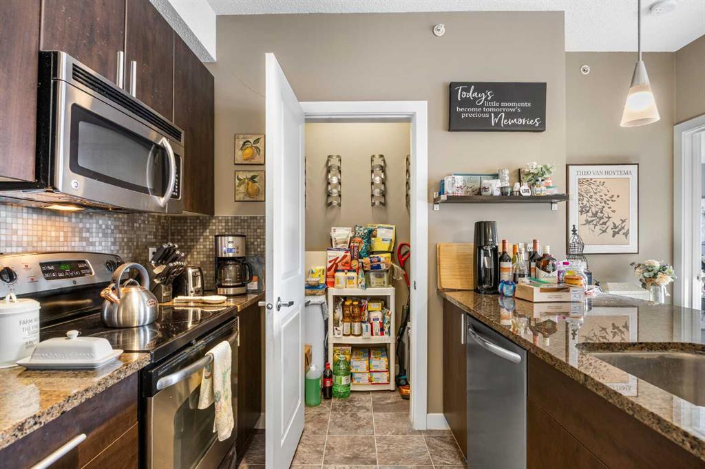 This bright TOP floor 2-bedroom, 2-bath unit spans 860 sqft and features 9-ft ceilings throughout with a sunny south-facing open floorplan. The well-sized Kitchen boasts granite countertops, a peninsula with breakfast bar, stainless steel appliances, and a walk-in pantry with ample storage. It opens seamlessly to the Dining area and spacious Living room, which leads to a south-facing balcony with a gas hookup. The Primary bedroom includes a walk-through closet and 4-piece ensuite, while the second bedroom, 4-piece bath, and in-suite laundry with storage complete this home. Titled underground parking adds convenience and peace of mind.