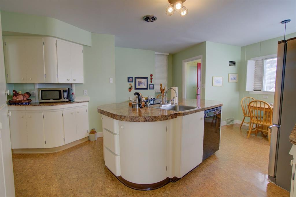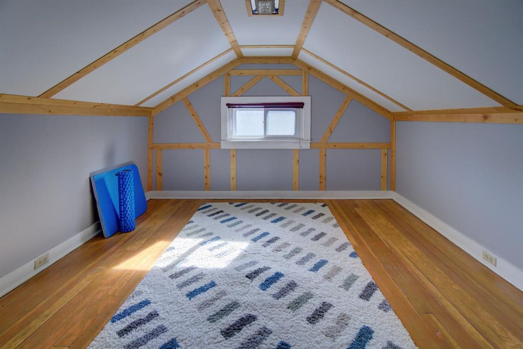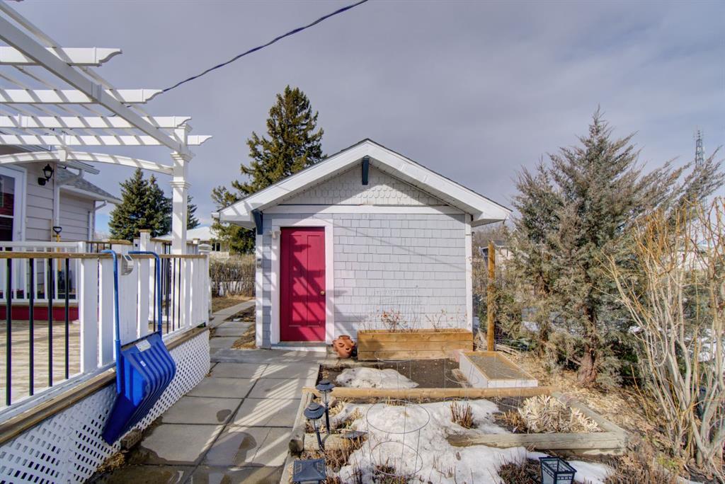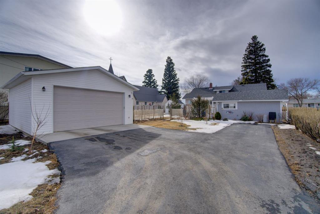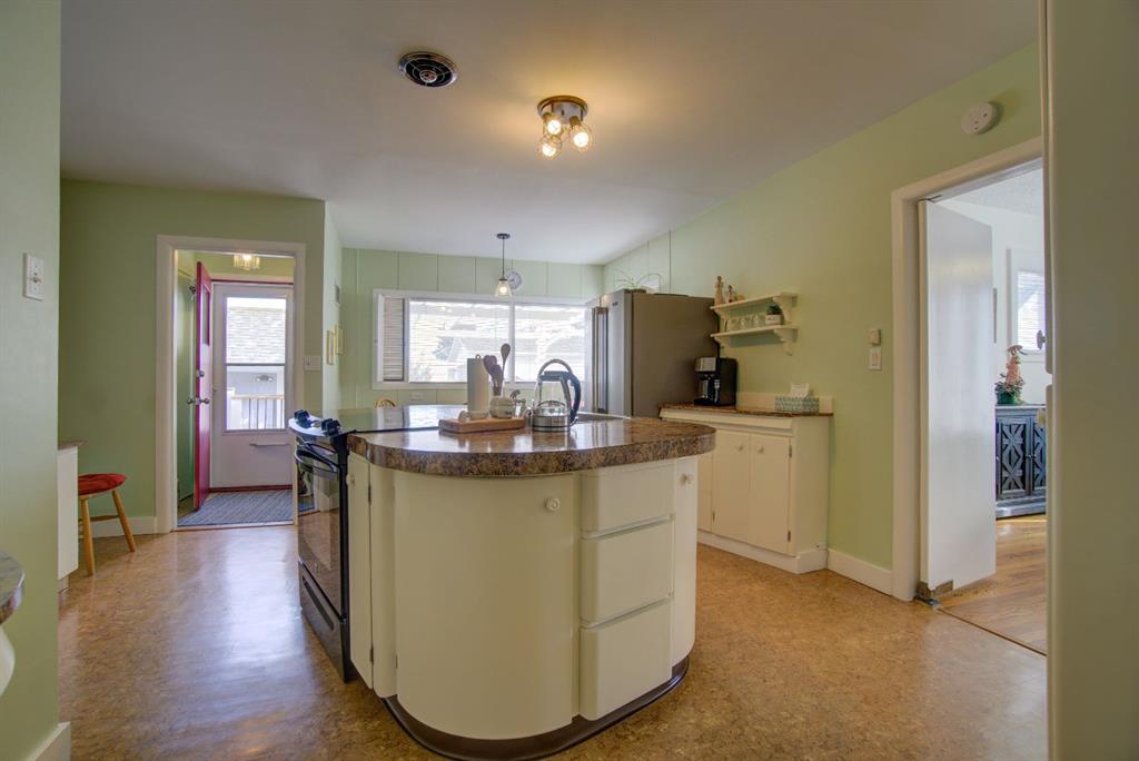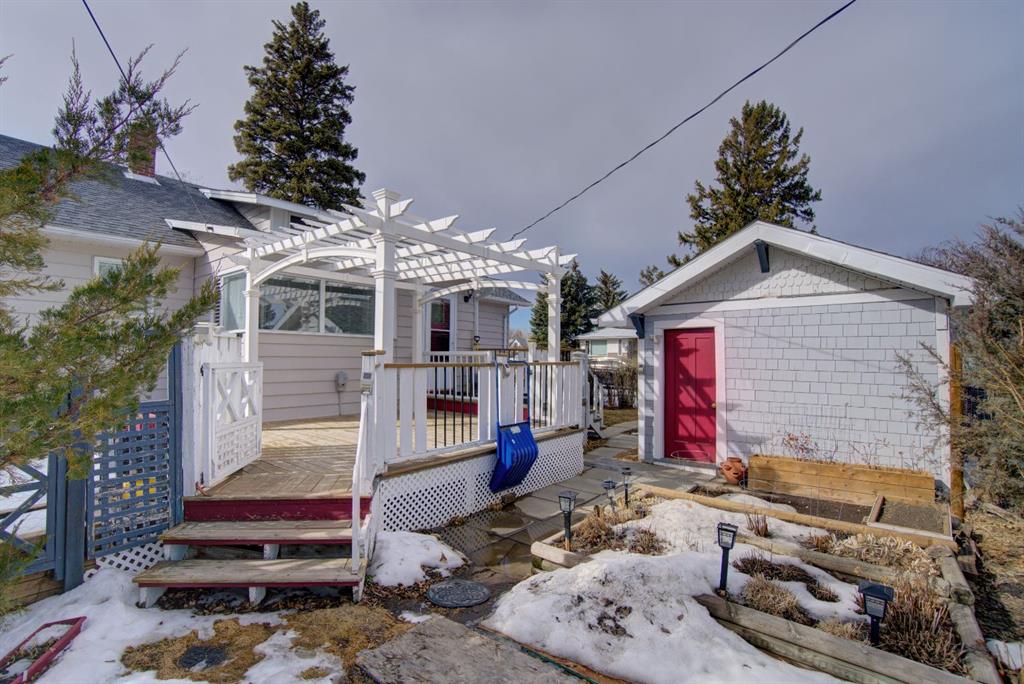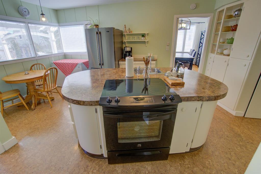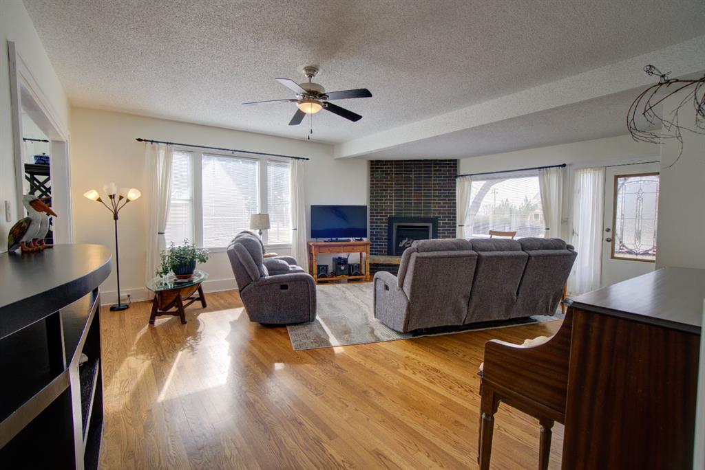 Have you been searching for a home full of character and charm? Welcome to this one-of-a-kind property ideally located within walking distance to downtown, set on an expansive corner lot surrounded by mature trees, beautiful perennials, and thoughtfully landscaped yard space. Step inside to a welcoming living room featuring large picture windows, original hardwood floors, a cozy corner gas fireplace, and built-in cabinetry, creating a warm and inviting space to gather. The home offers a true formal dining room complete with a charming transom window and a built-in corner china cabinet that could easily double as a stylish bar area. The unique kitchen showcases rounded architectural details, a large island with ample storage, and a bright breakfast nook overlooking the backyard. A convenient back entry adds functionality to the space. The main floor also features two spacious bedrooms plus a versatile office/laundry room, along with a 4-piece bathroom highlighted by a quaint chandelier that adds to the home’s character. Upstairs you’ll find two additional rooms that could be upgraded to bedrooms, along with a cozy reading or playroom area — perfect for kids, hobbies, or extra living space. The backyard is truly stunning, offering a large deck ideal for entertaining, garden boxes, deer fence around the garden area. mature trees, and flowers galore. The former single garage has been converted into the perfect workshop, and there’s still plenty of room with an oversized double detached garage and RV parking. This property offers space, charm, and endless potential — a home that truly must be seen in person to be appreciated.