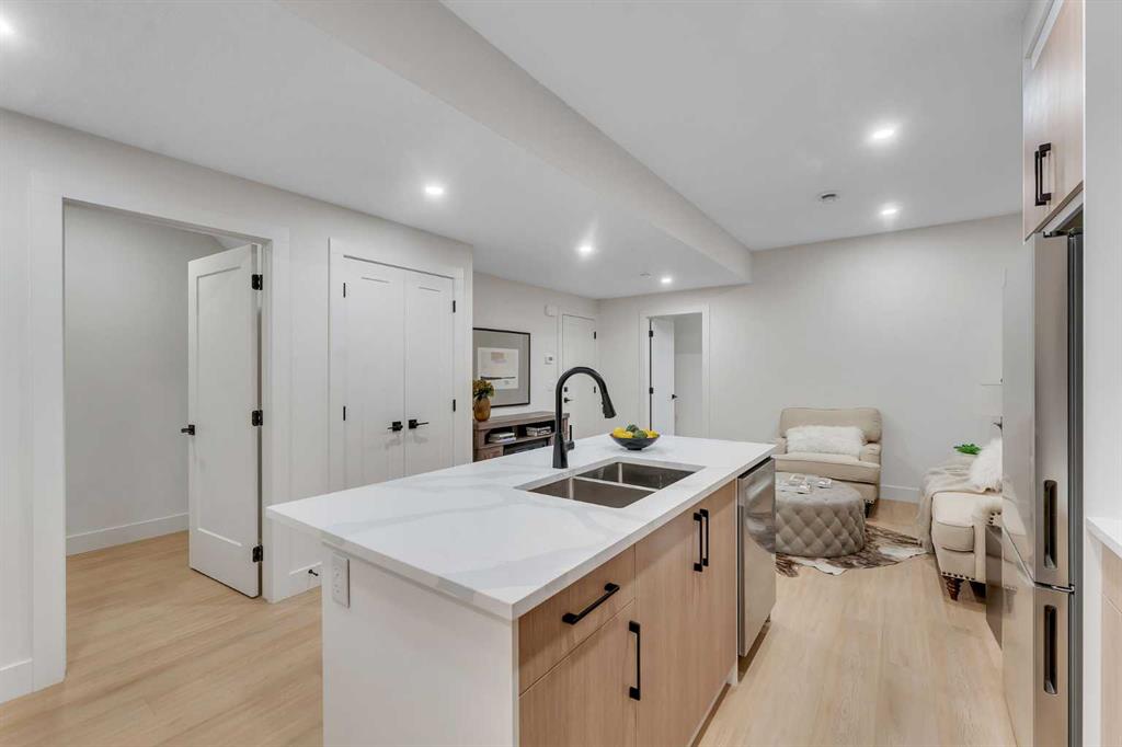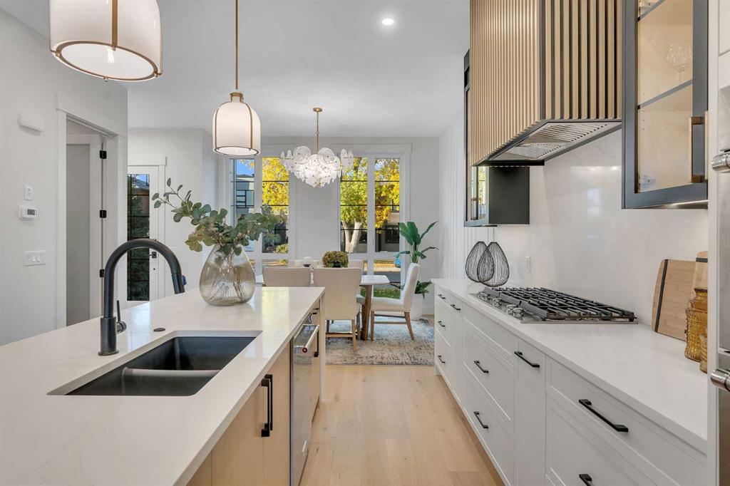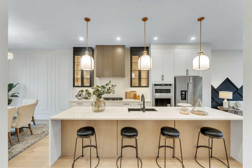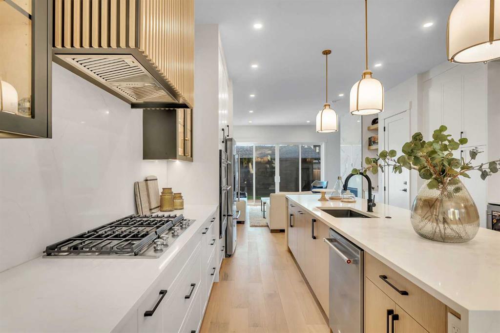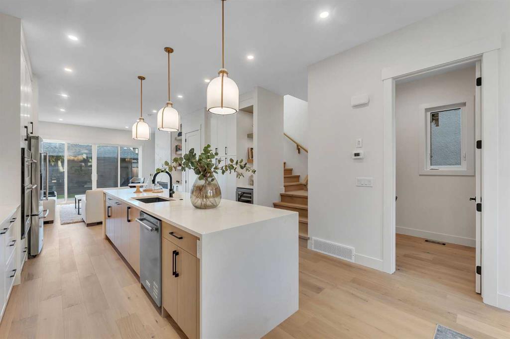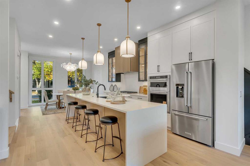 Welcome to the heart of Mount Pleasant, one of Calgary’s most sought-after inner city neighbourhoods. This newly built semi detached home combines modern design with practical family living, offering over 2,800 sq ft of beautifully finished space including a legal suite. Thoughtfully designed for flexibility, it’s ideal for multi generational living or rental income without compromise on comfort or style. The open concept main level features large windows that fill the home with natural light. The kitchen showcases KitchenAid appliances, sleek and stylish custom cabinetry, quartz countertops, and a stunning full slab backsplash that creates a clean, seamless look. A large island anchors the space, perfect for casual meals or conversation. The adjoining dining and living areas flow naturally toward the deck, creating an inviting space for both family time and entertaining. A fully fenced, landscaped yard with a composite deck offers a private, low maintenance outdoor retreat. Upstairs, the primary suite is a true escape, featuring a large walk in closet and a spa inspired ensuite with Italian tile, a steam shower, freestanding tub, and dual vanities. Italian tile continues through all bathrooms, adding a consistent, upscale feel. Two additional bedrooms, a full bath, and a laundry room complete the level, designed with both privacy and function in mind. The legal two bedroom basement suite is self contained with its own entrance, full kitchen, laundry, and bath, ideal for extended family or generating additional income. The design and sound separation ensure comfort for both households. Additional features include smart toilets, engineered hardwood on the main and upper floors, durable LVP in the basement, and a double detached garage offering secure parking and extra storage. The exterior blends red brick, and modern accents for timeless curb appeal. Mount Pleasant continues to be one of Calgary’s most desirable communities, known for its mature tree lined streets, walkability, and welcoming feel. Residents enjoy easy access to Confederation Park, the community pool and sports facilities, as well as cafes and boutiques along 4th Street NW. Close proximity to SAIT, Kensington, and downtown makes daily life convenient and connected. A home that delivers quality construction, flexible living, and a location that will always be in demand. Move in ready. Photos are from the other side of the duplex and are provided for reference only. Finishes, layout, and measurements may vary slightly.