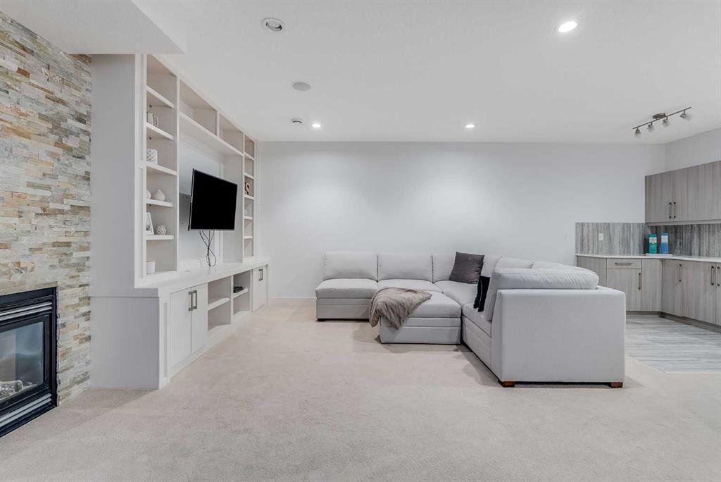 The FULLY DEVELOPED BASEMENT extends your living space with a second fireplace, BUILT-IN MEDIA SHELVING, a WET BAR with beverage fridge, a fourth bedroom, and a luxurious STEAM SHOWER.
