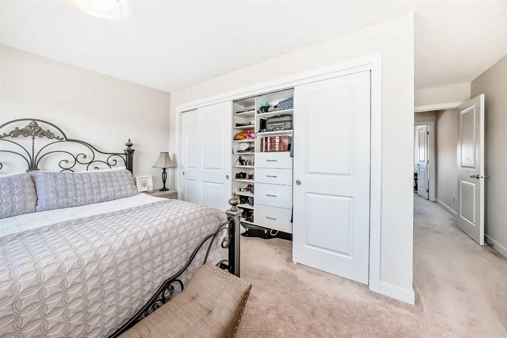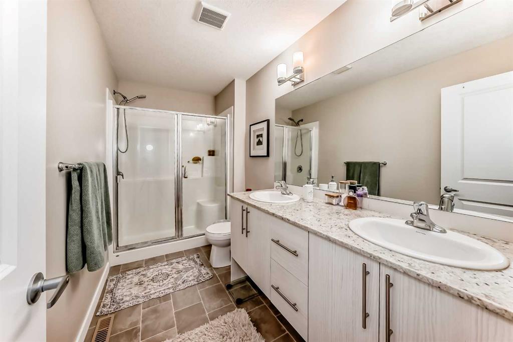 The kitchen features stainless steel appliances, while the upper level includes two spacious ensuite bedrooms with custom California closets, an ideal setup for professionals, guests, or shared living. You’ll also appreciate the convenience of upper-floor laundry and generous storage throughout.