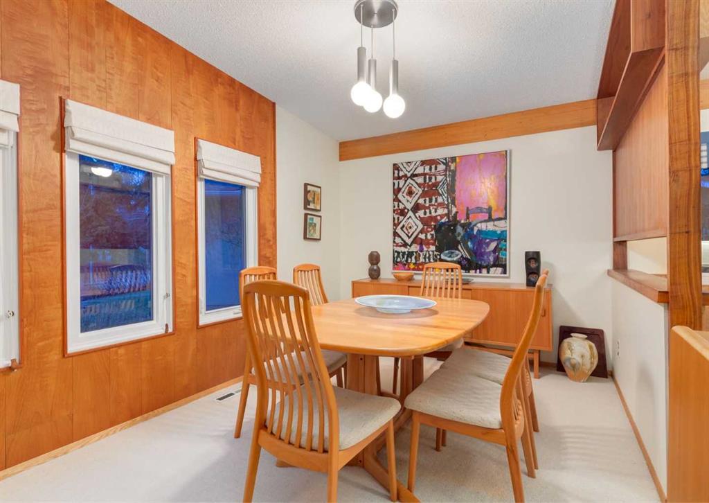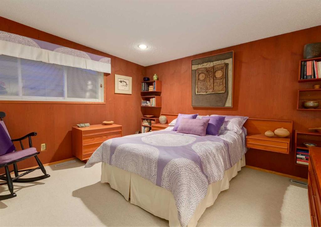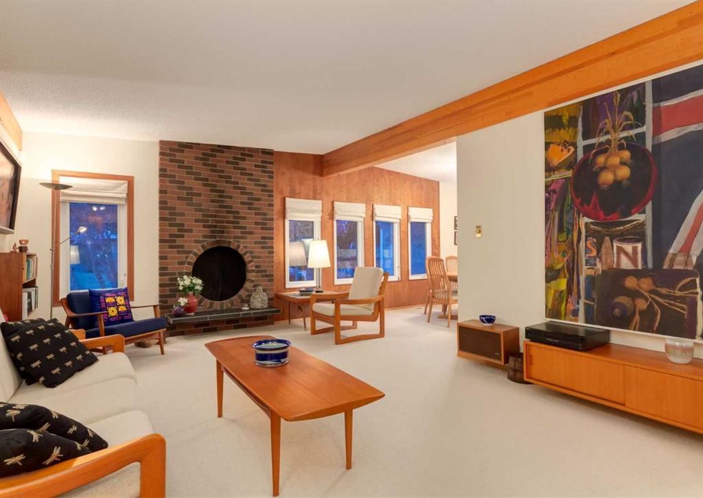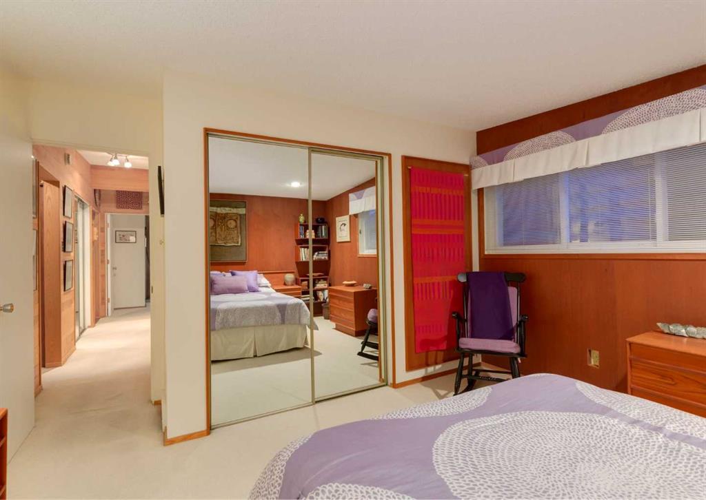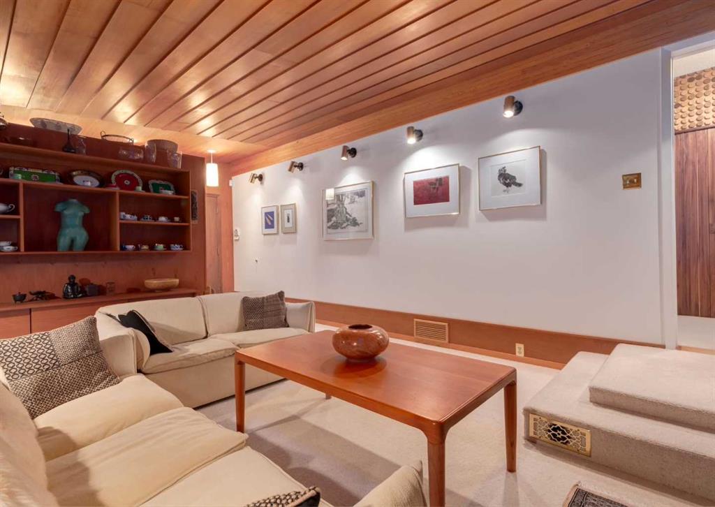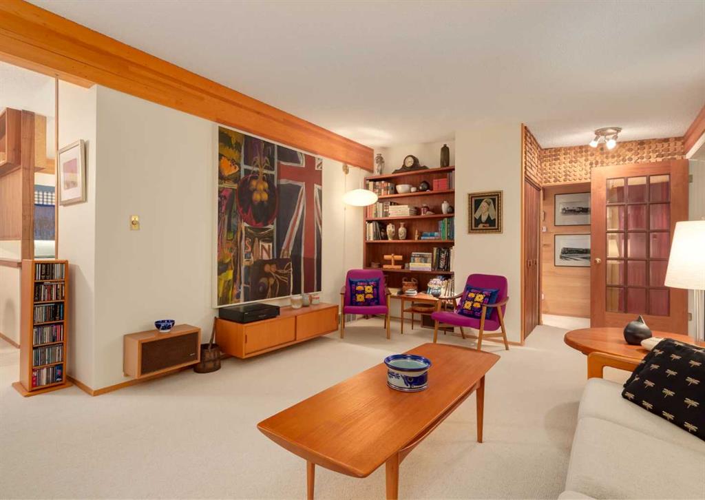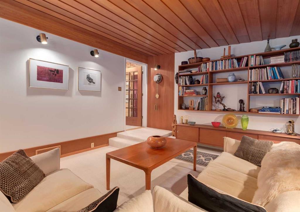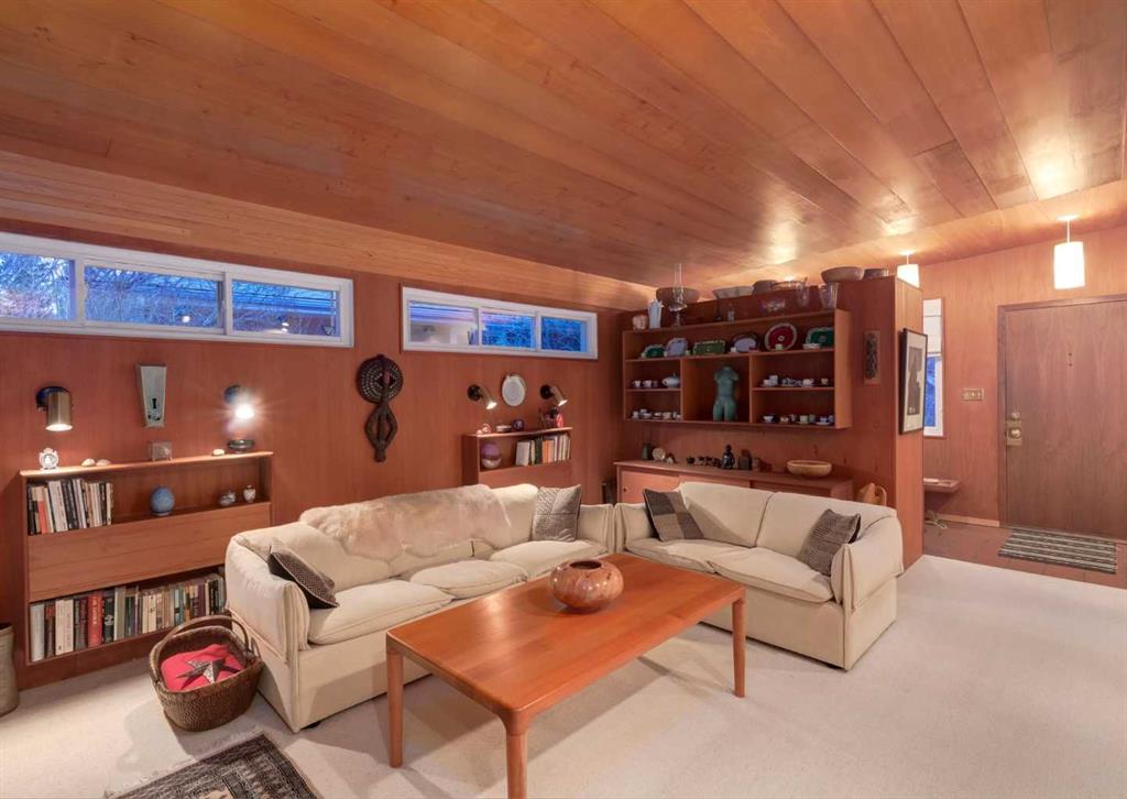 ***Open house Saturday April 25, 1-3pm*** This meticulously maintained mid-century home is a true architectural time capsule—lovingly preserved and thoughtfully crafted, with custom woodwork carried throughout nearly every space that cannot be replicated. From the moment you step into the vaulted, tiled mudroom, you’re welcomed by clean lines, natural materials, and an abundance of light streaming through the windows. The main floor den is a standout, featuring rich wood paneling and custom built-in shelving—an ideal reading or work-from-home space. A single French door leads into the living room, where a timeless wood-burning brick fireplace and windows create a warm, inviting atmosphere. The dining area seamlessly connects to the kitchen, where original cabinetry has been impeccably maintained and a skylight fills the space with natural light. This level offers three well-sized bedrooms and a full bathroom, continuing the home’s cohesive design. The lower level, with its own separate side entrance, expands the living space with a family room, a vintage-inspired 4-piece bathroom, an additional flex room, and a dedicated art studio—perfect for creative pursuits or a private workspace. Situated on a pie-shaped lot, the backyard features a large custom composite deck with plenty of room to relax or entertain. The oversized garage is a true highlight, complete with a beautifully crafted custom workbench and extensive built-in cabinetry. The studio and workshop spaces are truly special that reflect the creativity and care poured into this home over the years. This is a home for a discerning buyer—someone who recognizes the significance of mid-century design, values craftsmanship, and appreciates a property that has been carefully maintained and preserved. A truly special offering in one of NW Calgary’s most sought-after communities. Steps from Varsity Acres School and close proximity to F.E. Osborne, St. Vincent de Paul, and Marion Carson Schools. Minutes from the University of Calgary, Market Mall, Foothills/Children’s Hospital, University District, and the Bow River pathways. Opportunities like this are incredibly rare. Please click on media for the video and schedule your private viewing today.