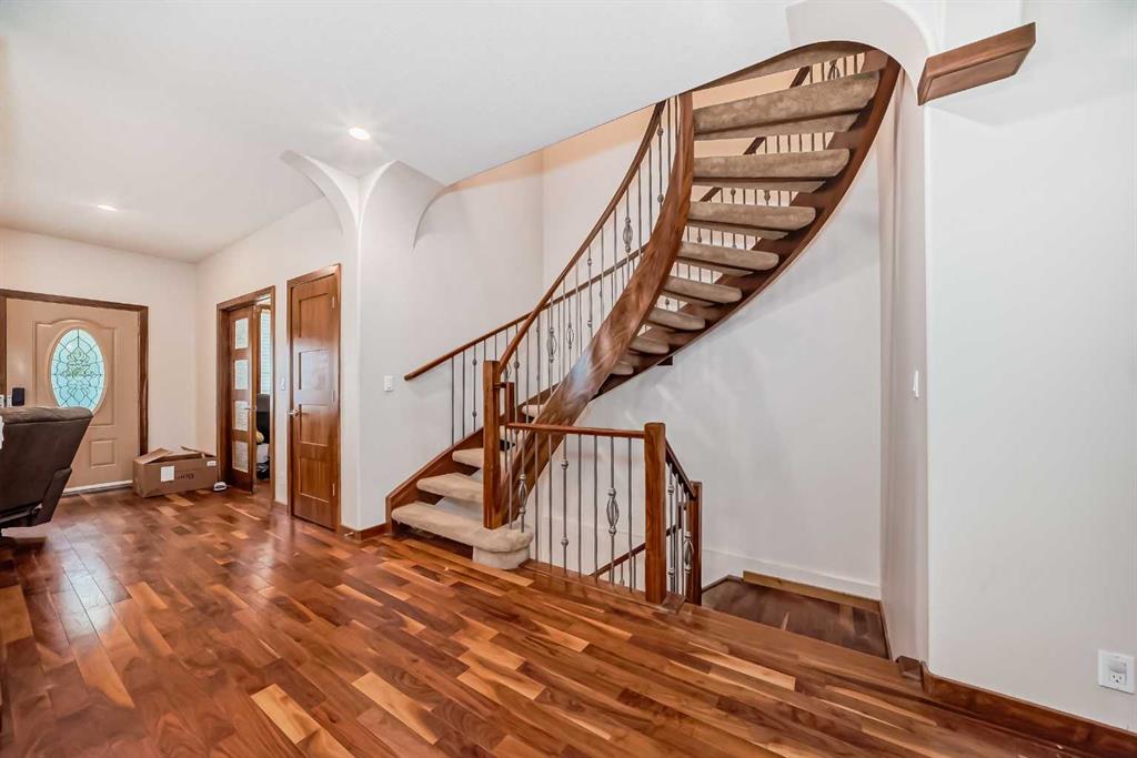 Upstairs, a curved staircase leads to the master suite, a tranquil retreat complete with a custom walk-in closet, private balcony with sunset views, and a luxurious 5-piece ensuite featuring a skylight, double vanity, soaker tub, and separate shower. Two additional bright and spacious bedrooms share this level, along with a conveniently located laundry area. The finished basement offers additional living space with a rec room for movies and games, a fourth bedroom, another full bathroom, and ample storage. Outside, the west-facing backyard is perfect for enjoying sunny days on the full-width deck, surrounded by mature trees and a fenced grassy yard ideal for family activities. An insulated double detached garage provides parking convenience. Close to School, transit, shopping easy access to Centre street and 4th Street. Call to view before it’s gone!.