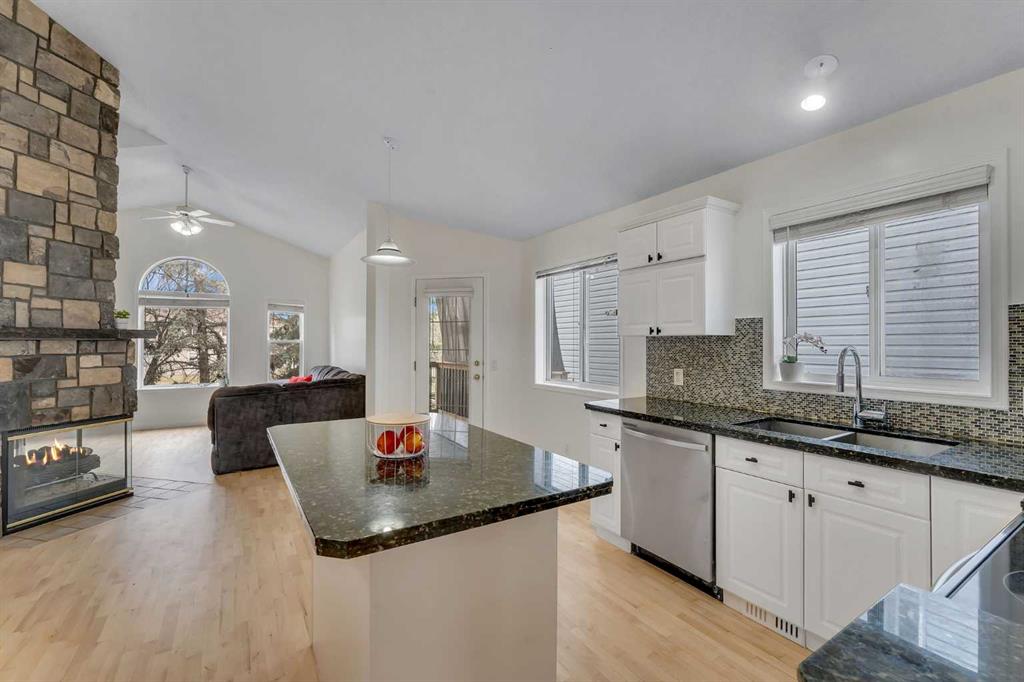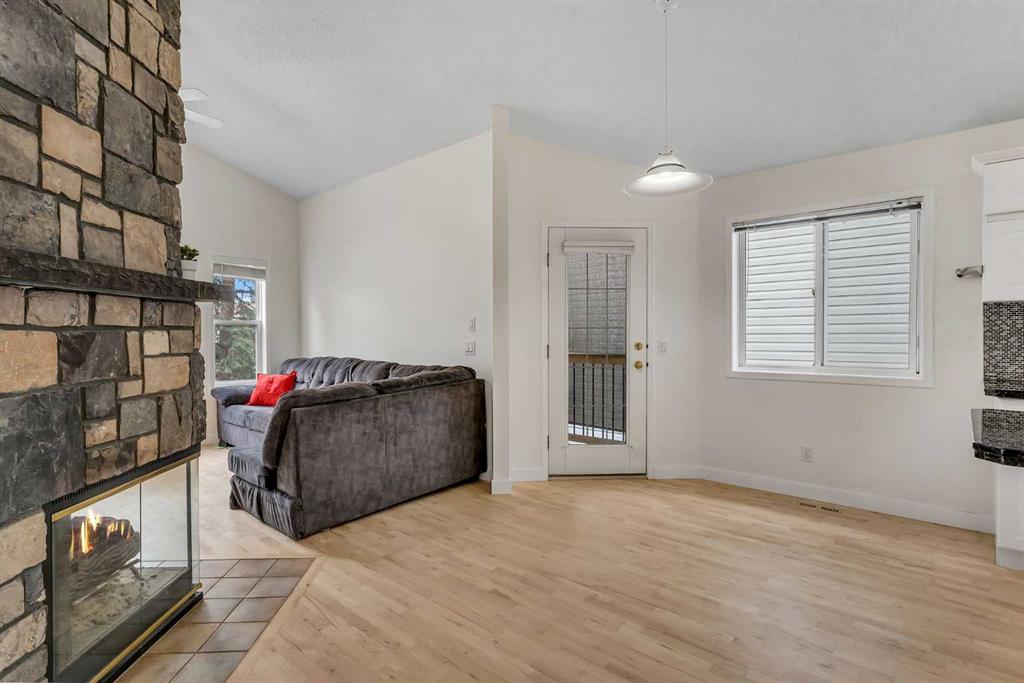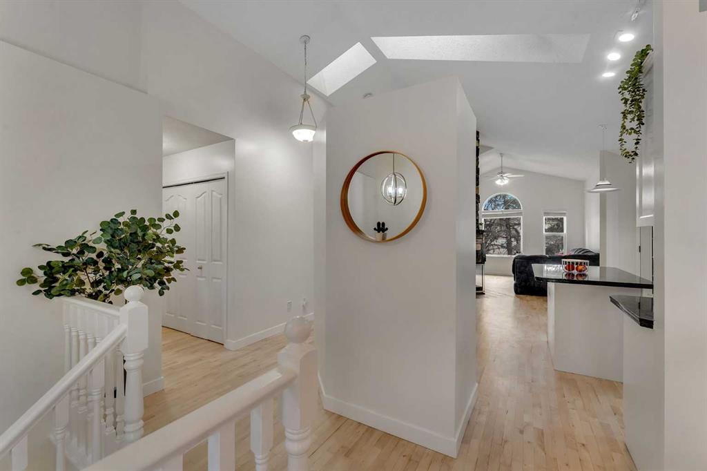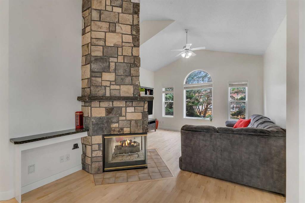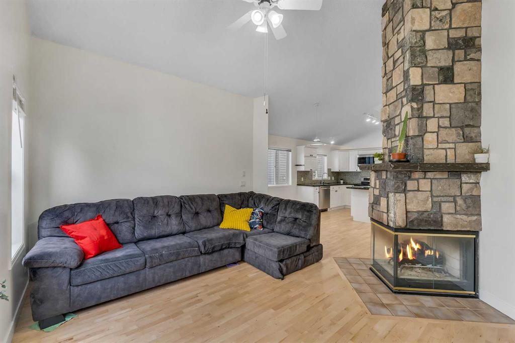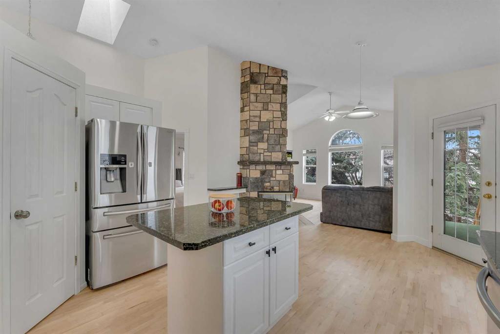 Step inside and you are immediately greeted by soaring VAULTED CEILINGS, FRESH PAINT and an abundance of natural light pouring through the SKYLIGHTS, creating an open and airy feel that you can’t help but notice right away. The main floor flows effortlessly from the spacious living room – anchored by a stunning THREE-SIDED GAS FIREPLACE shared with the lower level – into the dining area and kitchen featuring granite countertops, a kitchen island, pantry, and a full appliance package including. Beautiful REFURBISHED hardwood, vinyl plank, and linoleum flooring run throughout, adding warmth and character to every space. The primary bedroom is generously sized and comes complete with a private 4-piece ensuite, while a second bedroom and additional 4-piece bathroom round out the main floor perfectly.