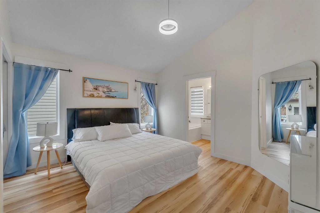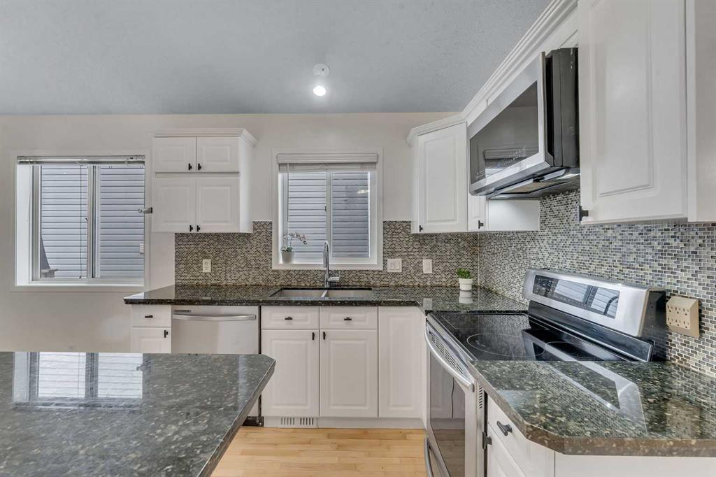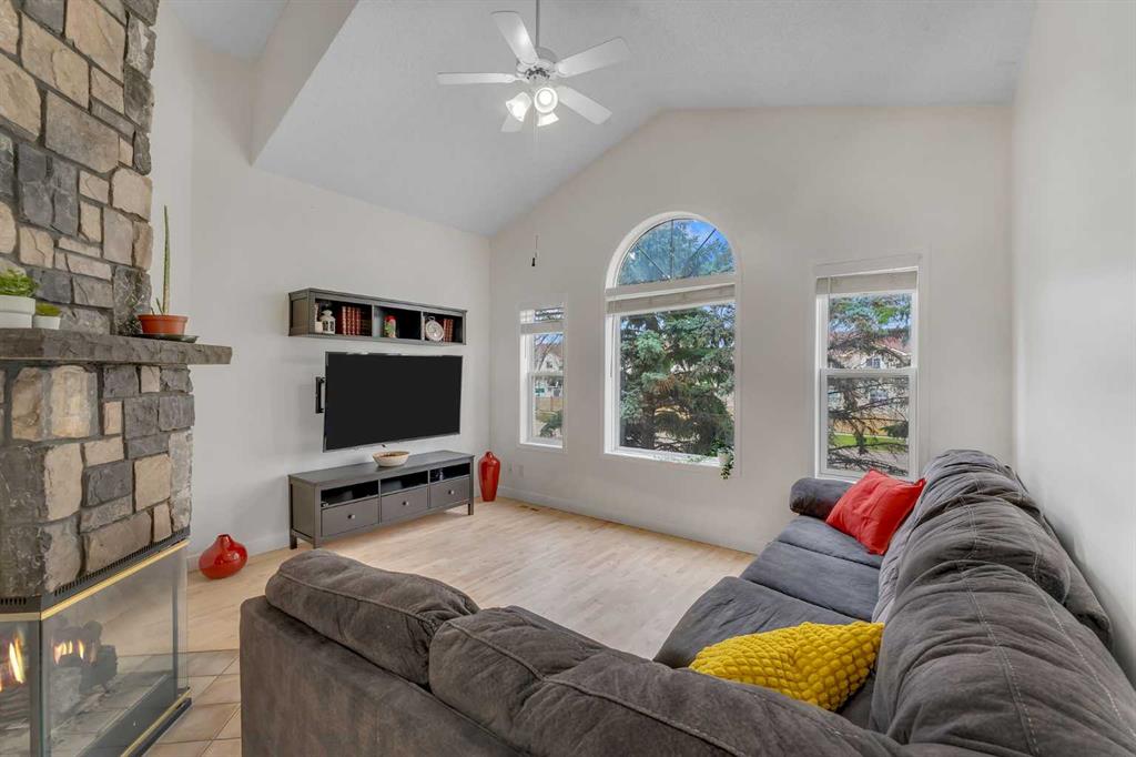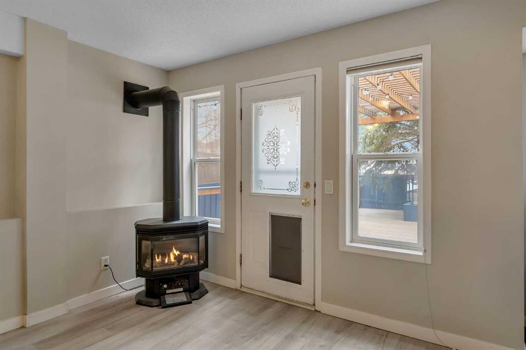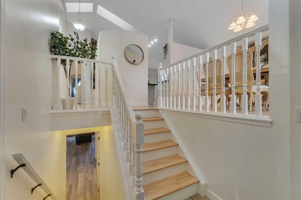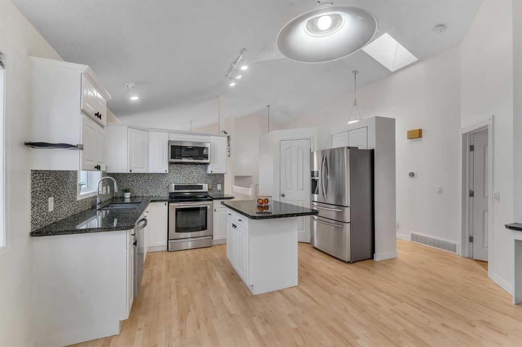 Step inside and you are immediately greeted by soaring VAULTED CEILINGS, FRESH PAINT and an abundance of natural light pouring through the SKYLIGHTS, creating an open and airy feel that you can’t help but notice right away. The main floor flows effortlessly from the spacious living room – anchored by a stunning THREE-SIDED GAS FIREPLACE shared with the lower level – into the dining area and kitchen featuring granite countertops, a kitchen island, pantry, and a full appliance package including. Beautiful REFURBISHED hardwood, vinyl plank, and linoleum flooring run throughout, adding warmth and character to every space. The primary bedroom is generously sized and comes complete with a private 4-piece ensuite, while a second bedroom and additional 4-piece bathroom round out the main floor perfectly.