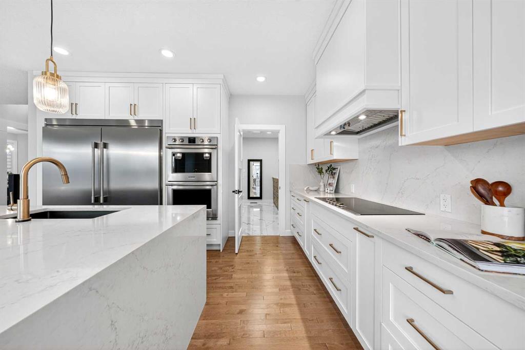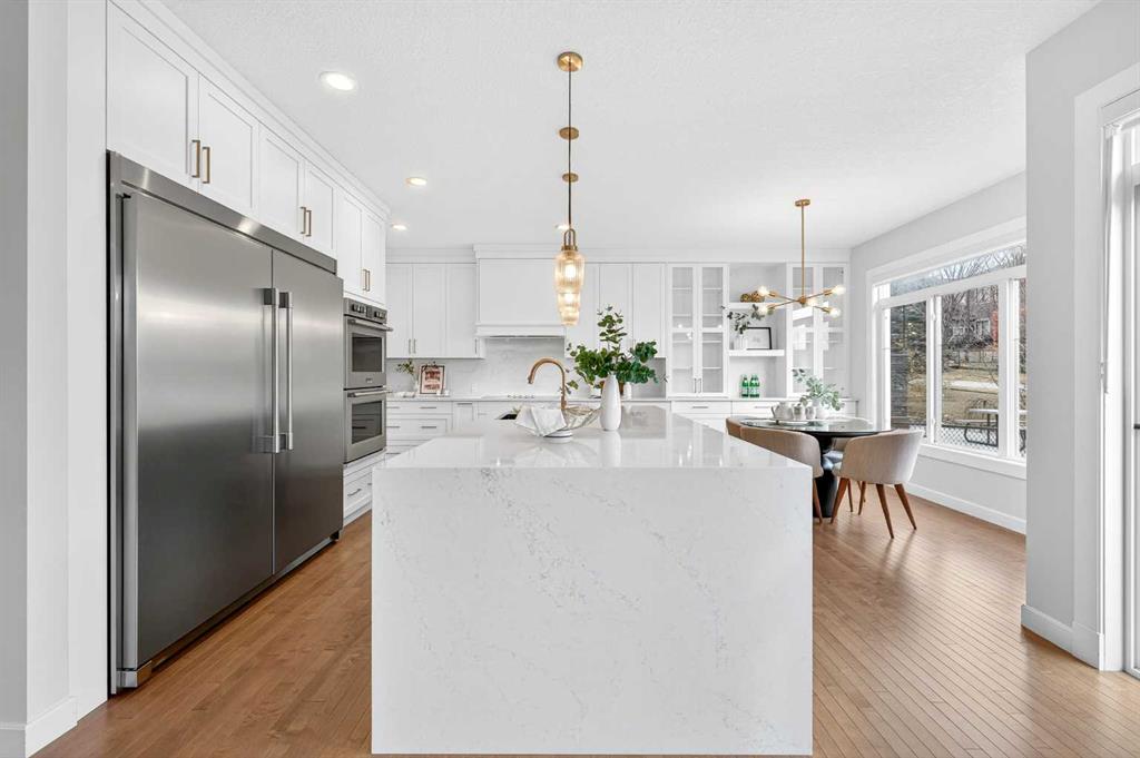 The gourmet Kitchen is a showpiece, featuring a massive quartz waterfall centre island (9’8” × 4’6”), stainless steel appliances including a Frigidaire Professional full-size side by side Fridge and Freezer, double wall oven, and electric cooktop, plus white soft-close cabinetry with gold hardware and quartz backsplash. A walk-through pantry and butler pantry with beverage fridge add storage and functionality, flowing seamlessly to the mudroom with built-in drawers, cabinets, and bench, which connects to the double attached garage with overhead storage. The Breakfast nook opens to a composite deck with aluminum and glass railing and gas hookup, perfect for outdoor dining and entertaining. A powder room completes the main level.