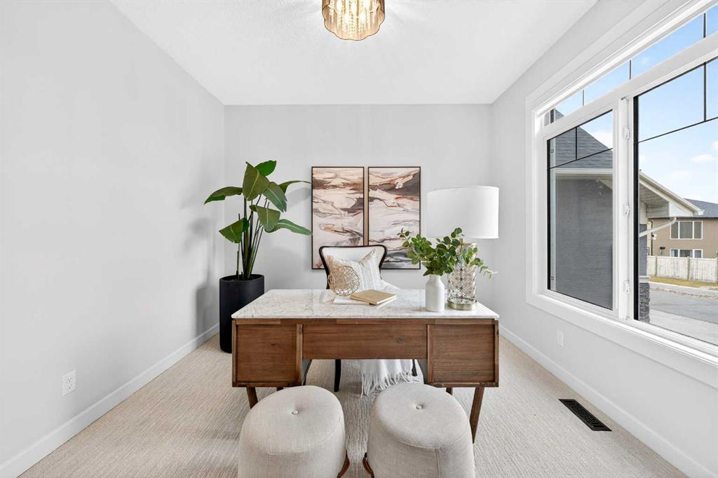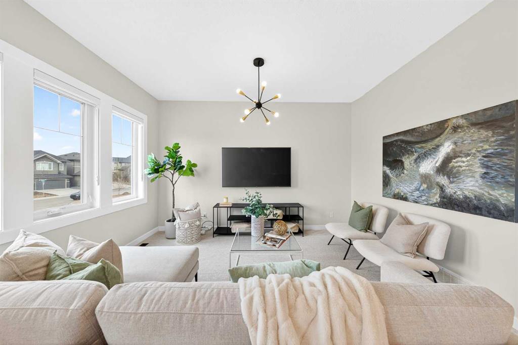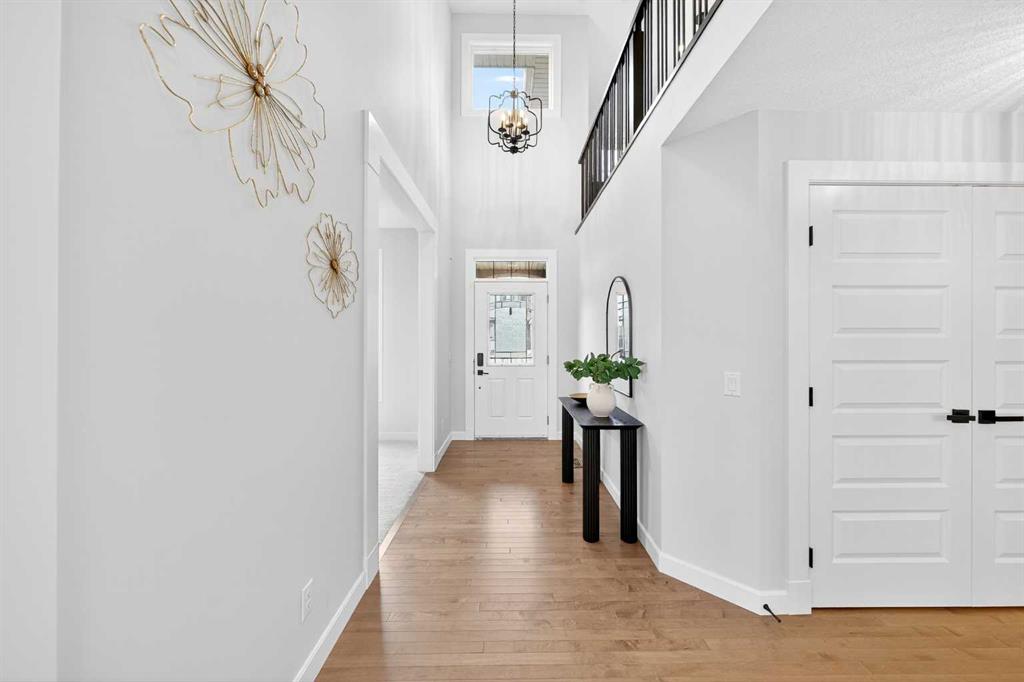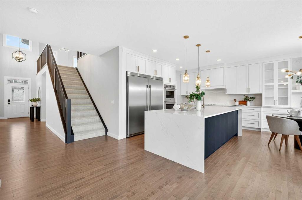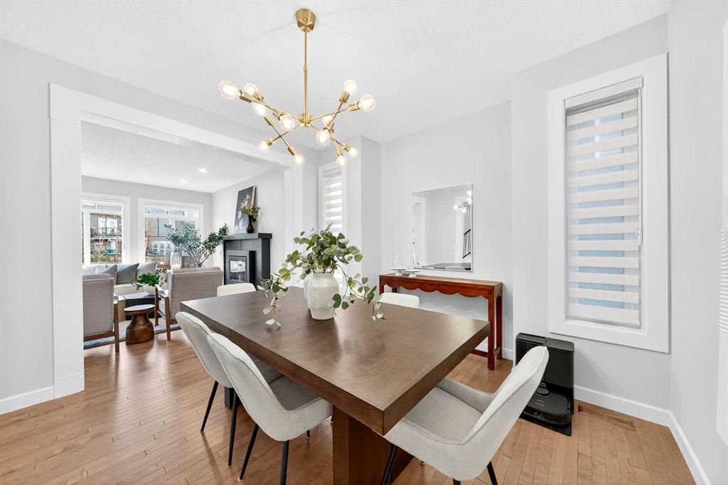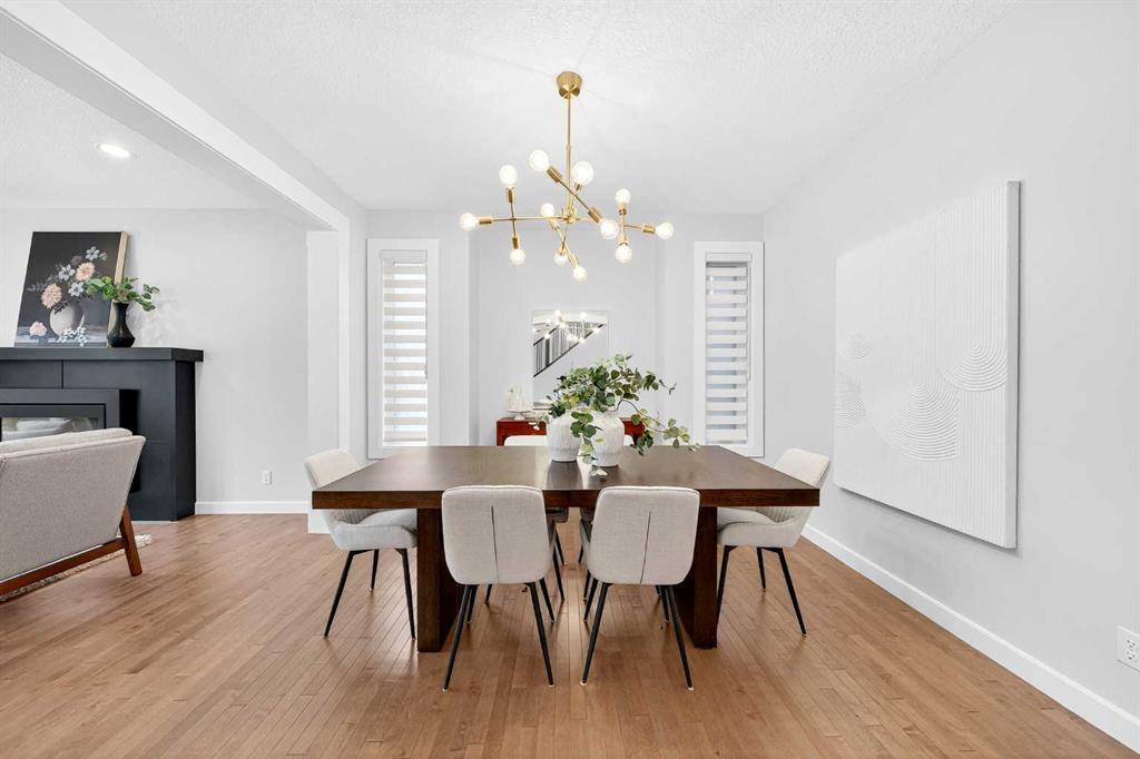 Step inside the soaring two-storey foyer to a den with soft carpet, then into the open-concept main floor with 9-ft ceilings and rich hardwood flooring throughout. The formal Dining Room comfortably seats eight, while the sun-filled living area, anchored by large windows, offers a warm and inviting space for everyday living.