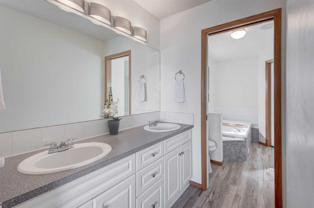 OPEN HOUSE Sat April 11th 2:00PM – 4:30PM *** This Turn-key three-bedroom, three-bathroom walk-out bungalow is located in a quiet Somerset cul-de-sac & backing onto the Green Belt. With over 2,462 square feet of finished living space, the home features an open-concept layout filled with natural light. A three-sided gas fireplace sits between the living room and formal dining area, providing a nice focal point for the main floor. The kitchen includes plenty of cabinetry, a pantry, and a breakfast nook for casual meals. The primary suite offers a large walk-in closet and a five-piece ensuite equipped with dual vanities, a jetted tub, and a separate shower. A second bedroom and another full bathroom complete the main level. Downstairs, the finished walk-out basement serves as a great space for hosting, featuring a games area, and a family room with a second fireplace. This floor also contains the third bedroom, which has a walk-through closet leading to a 4-piece guest bathroom. Outside, the elevated rear balcony and covered lower patio overlook a fenced yard that backs directly onto greenspace and walking paths. Practical features include a double front-attached garage with a new garage door (2026), and a wide driveway with parking for two extra vehicles. New Water Heater (2021), Siding (2021), Roof (2016), LVP Floors main (2022), A/C & Furnace (2016) This property is situated close to schools, shopping, Splash Park, the YMCA, and transit links. It is a solid, move-in-ready house in a convenient location. Book your showing today.