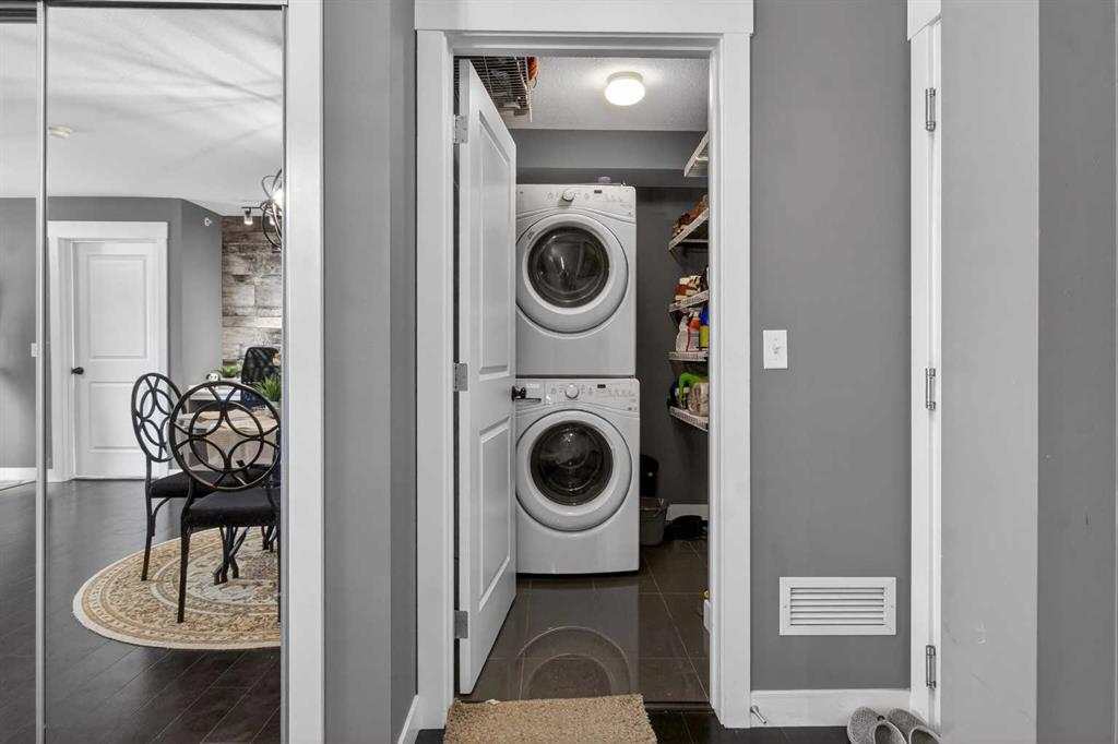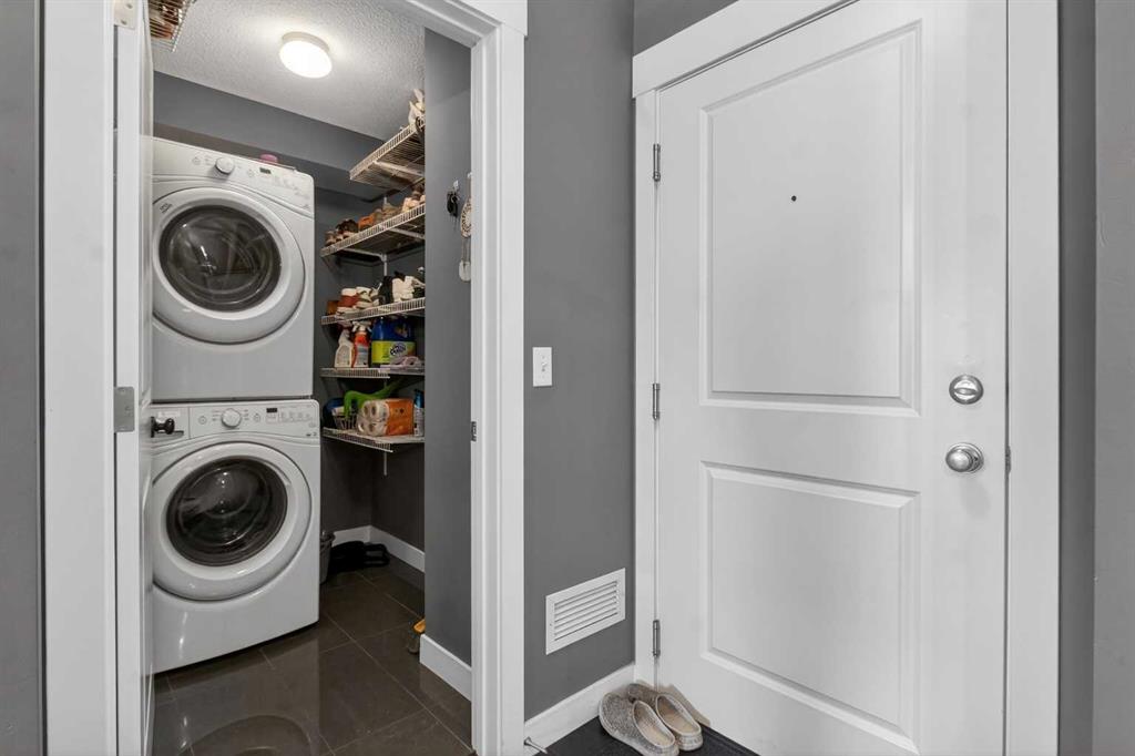 Welcome to this incredibly bright and spacious 818-sq-ft unit in a family-friendly community! This thoughtfully curated 2 – bedroom, 2–bathroom top–floor unit in Skyview Ranch blends style and substance effortlessly, with every room crafted for comfort, natural light, and connection. Morning sunshine streams through the patio doors, bathing the open-concept living area in a gentle glow. From the living room, sliding glass doors usher you onto a generous balcony overlooking the mountains, where you can savor outdoor meals all summer long. The spacious kitchen, framed with full-height cabinetry and refined finishes, feels both grounded and welcoming, including quartz countertops, stainless steel appliances, in-suite laundry, cork flooring, and carpet. A modern light fixture anchors the dining area, perfectly centering your dining table. A built-in desk area is nestled between the dining and living rooms, offering a convenient place for remote work or school assignments. Both bedrooms are ample and finished with luxurious carpeting. The primary bedroom boasts a walk-through closet that opens into a private 4-piece ensuite with a tub/shower combo. The second large bedroom on the far side of the unit is served by an adjacent 4-piece bath. The in-suite laundry is a welcome convenience and provides sufficient storage. This condo also includes the convenience of a titled underground parking stall, along with an additional storage locker located in front of the stall, perfect for seasonal items. As a resident of Skyview Ranch, you’ll enjoy an unbeatable lifestyle with access to schools, shopping, restaurants, parks, and excellent transportation routes, making commuting easy. With quick access to Stoney Trail, Deerfoot Trail, CrossIron Mills, Amazon shipping depot, and The Airport. You’ll be well-connected to go anywhere you want to explore. Schedule your showing today!