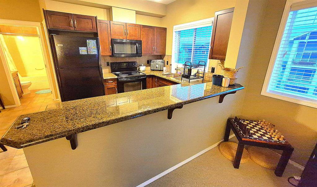 Step inside and feel the spacious, airy vibe right away! The oversized foyer, 9-foot ceilings, and huge southeast-facing windows flood the home with natural light all day long. The elegant tile flooring flows into the bright ‘U’-shaped kitchen, complete with loads of cabinet space, a granite countertop with raised bar seating, undermount double sink, and a new stainless steel dishwasher (2023). From your bright kitchen window over the sink, you can catch a glimpse of the mountains.