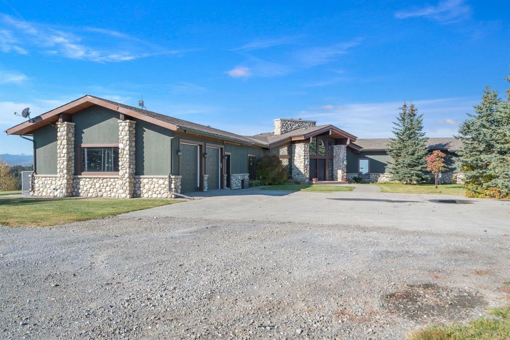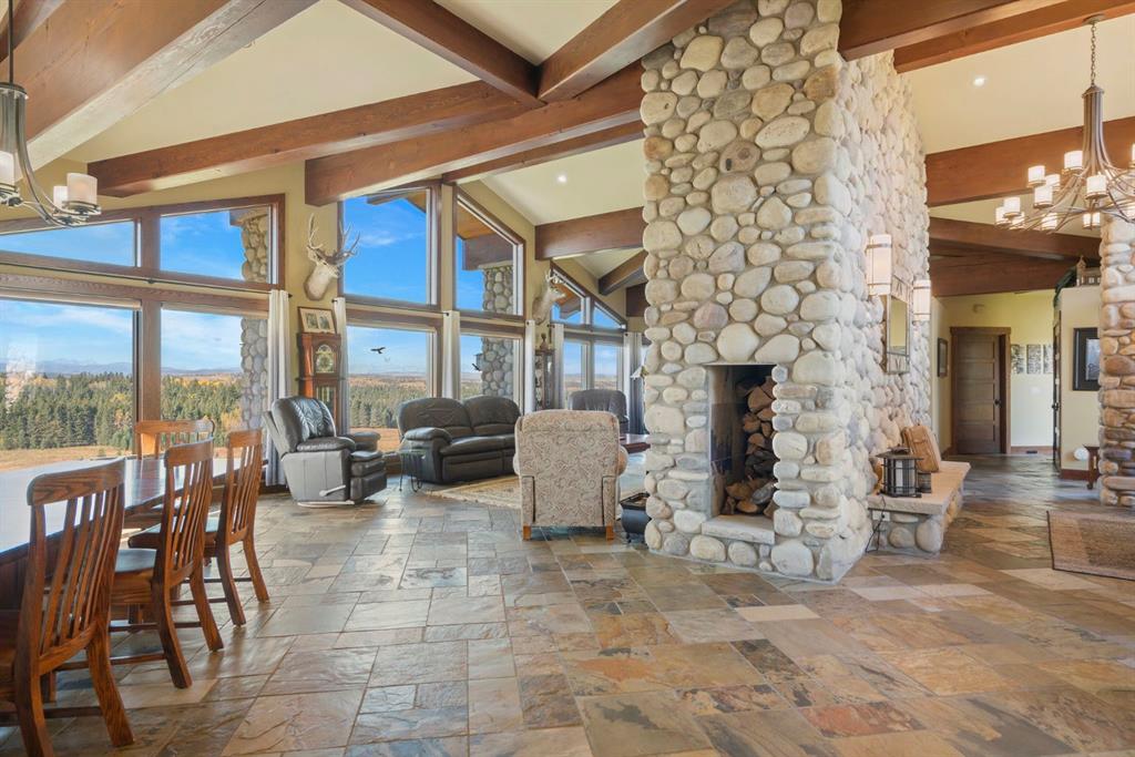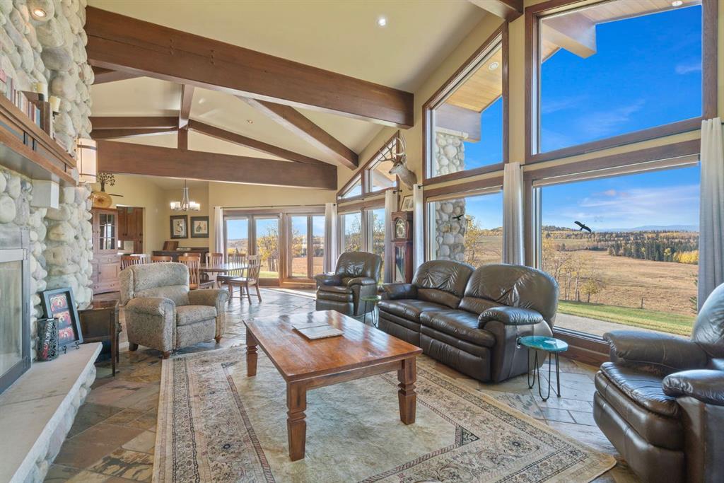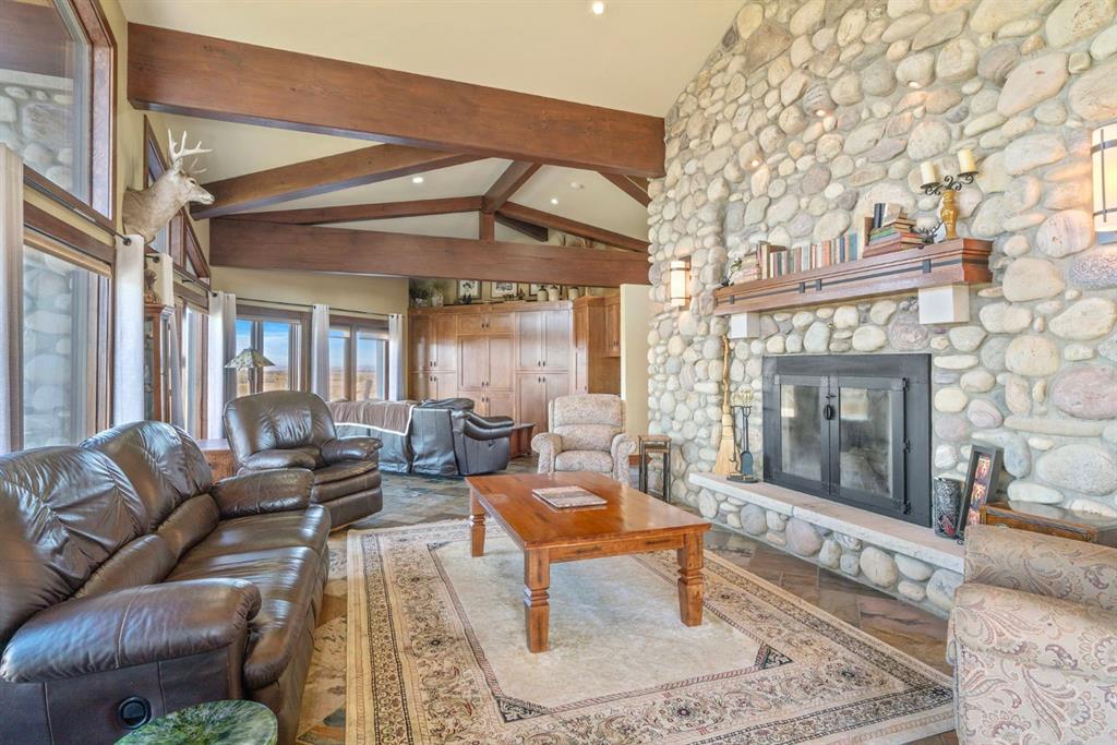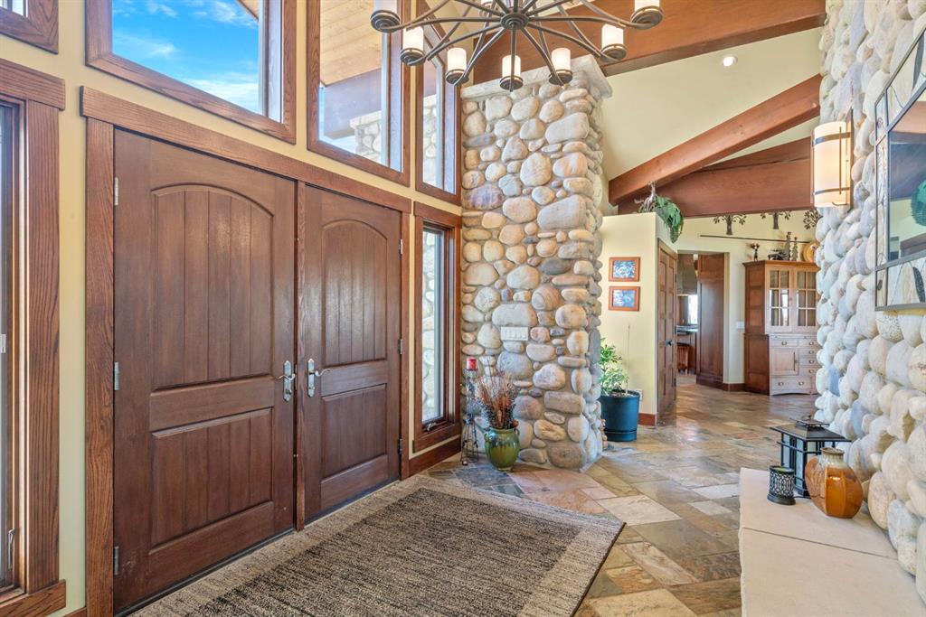Surrounded by rolling prairie and framed by the Rocky Mountains, this 3,388 sq ft bungalow is a one-of-a-kind country estate offering space, sophistication, and tranquility. Inside, vaulted timber-beamed ceilings, solid wood doors, and hand-finished millwork reflect the care and artistry poured into every detail. The open-concept great room features a floor-to-ceiling river rock fireplace and walls of windows that fill the home with natural light while showcasing stunning mountain and valley vistas.