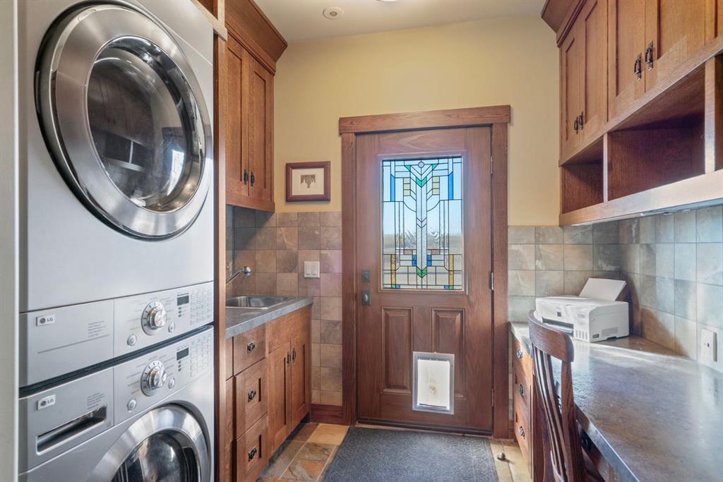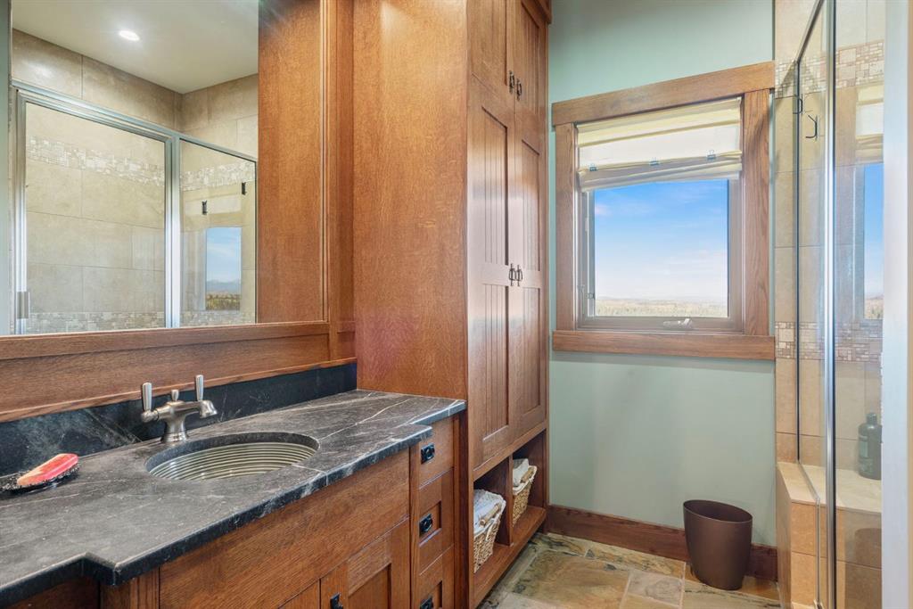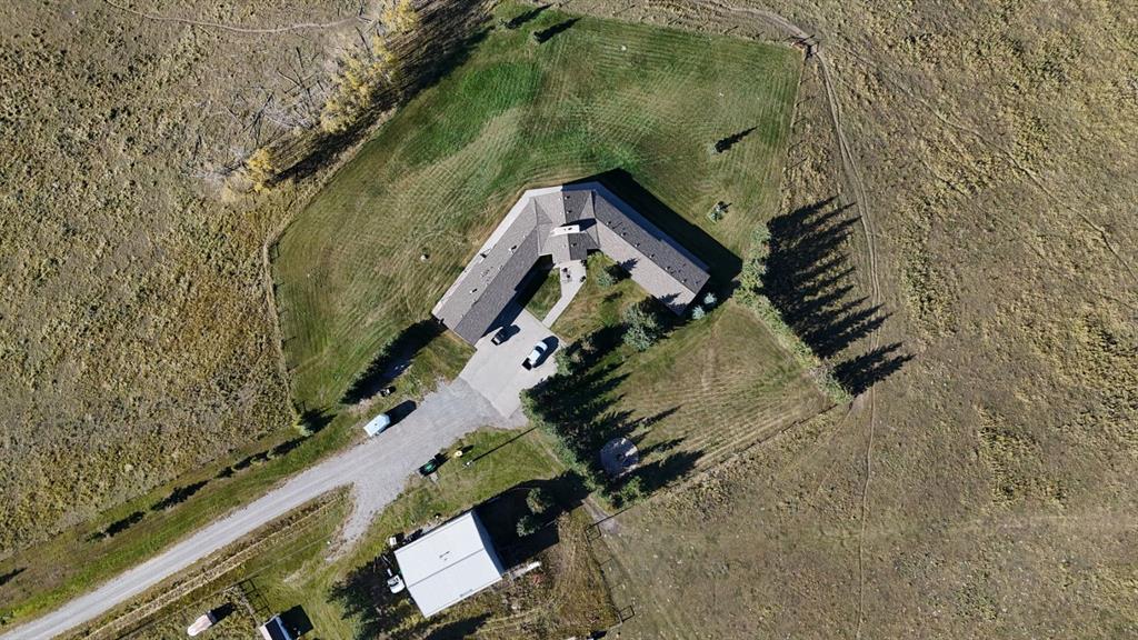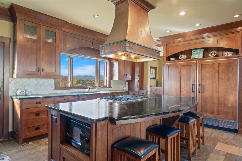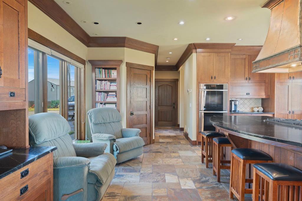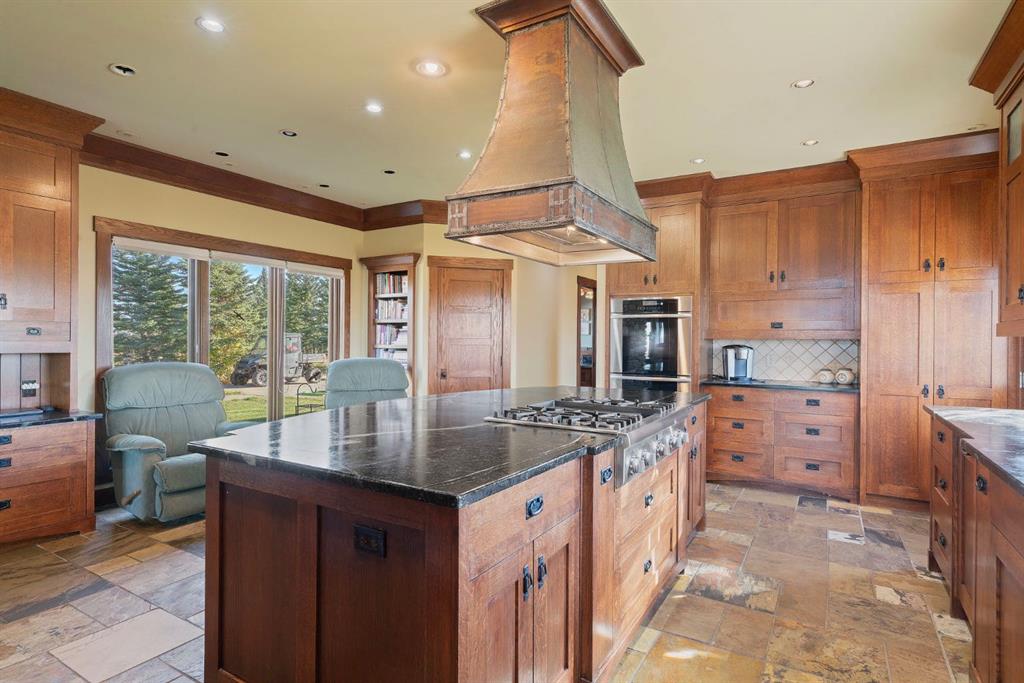 Surrounded by rolling prairie and framed by the Rocky Mountains, this 3,388 sq ft bungalow is a one-of-a-kind country estate offering space, sophistication, and tranquility. Inside, vaulted timber-beamed ceilings, solid wood doors, and hand-finished millwork reflect the care and artistry poured into every detail. The open-concept great room features a floor-to-ceiling river rock fireplace and walls of windows that fill the home with natural light while showcasing stunning mountain and valley vistas.