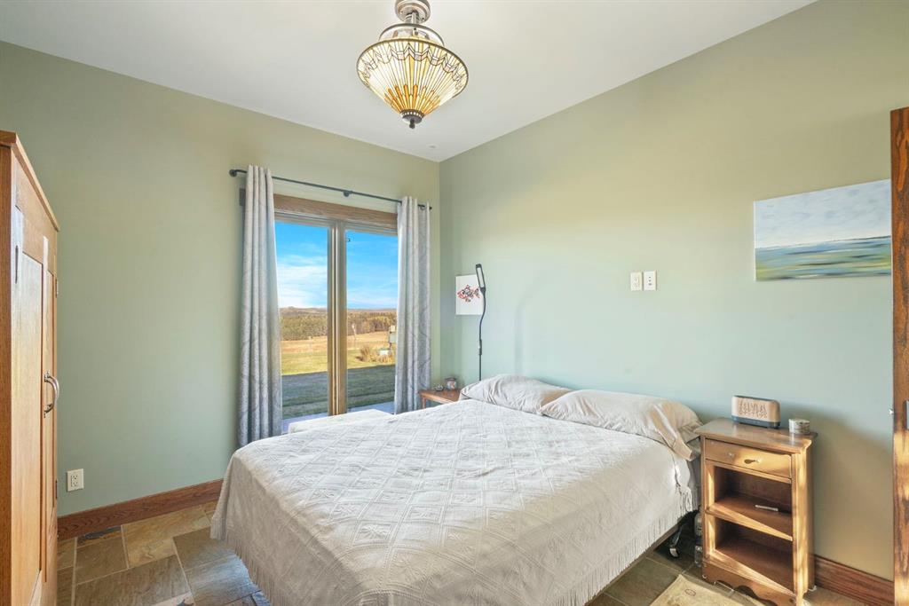 The primary suite is a true retreat, offering peaceful treed views and a spa-like ensuite with a deep soaker tub positioned perfectly to capture the beauty of the countryside. Two additional bedrooms, a full bath, and a two-piece powder room complete the main level. Practical comforts include in-floor heating, a spacious mudroom, and an oversized double attached garage with a dog run off the back.