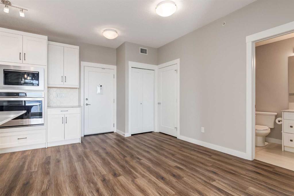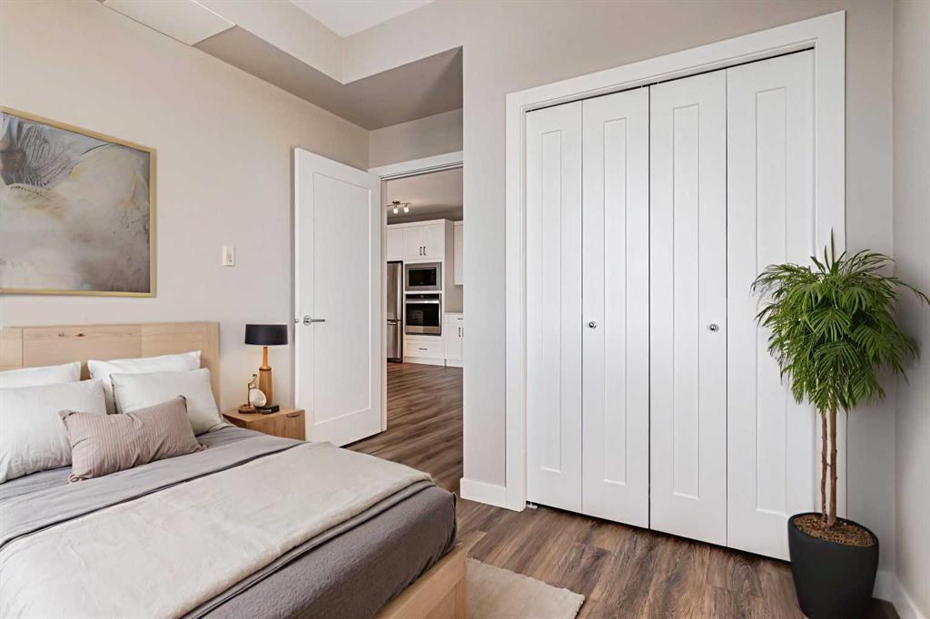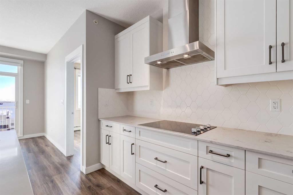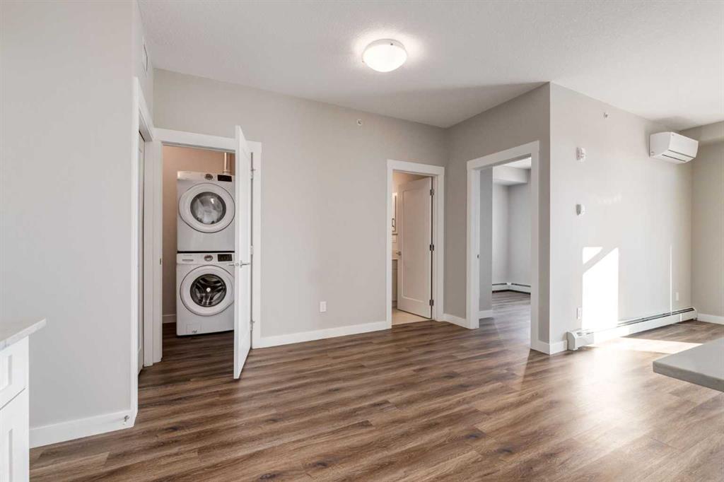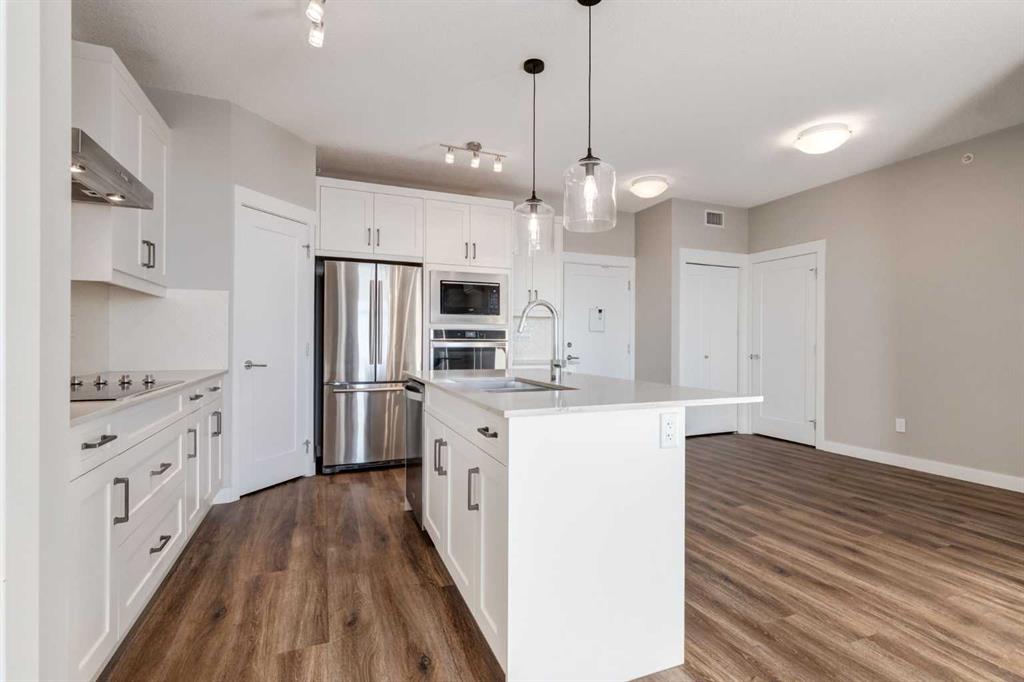 Beautifully upgraded top-floor 2 bedroom, 2 bathroom home in sought-after Cranston Ridge by Cardel Lifestyles offering exceptional natural light, premium finishes, and the convenience of 2 titled parking stalls—one underground and one surface—plus assigned storage. This bright and inviting unit features a stunning chef’s kitchen with a built-in wall oven and microwave, electric cooktop, generous pot drawers, white quartz countertops, a corner pantry, porcelain tile backsplash, and a large island accented with dual glass pendant lights. Luxury vinyl plank flooring extends through the main living areas and both bedrooms, creating a seamless modern aesthetic. The spacious primary bedroom includes a walk-through closet with custom organizers and leads to a beautifully appointed ensuite featuring double sinks, an upgraded vanity with drawers, full tile glass shower, porcelain tile flooring, linen storage, and matching white quartz counters. The second bedroom and full bathroom are ideal for guests, roommates, or a home office, offering the same elevated style and quality. Enjoy a spacious southeast-facing balcony with lovely views of the foothills—perfect for morning coffee, relaxation, and taking in Alberta’s open skies. Additional features include a full-size front-load washer and dryer, built-in shelving in the laundry room, and central air conditioning for year-round comfort. This top-floor unit provides privacy, upgraded living, and low-maintenance convenience in a well-managed, pet-friendly complex within the desirable community of Cranston. Close to scenic pathways, schools, shopping, Seton amenities, South Health Campus, and easy access to Deerfoot and Stoney Trail. Immaculate, thoughtfully designed, and move-in ready—this beautiful home offers exceptional value and lifestyle in one of Calgary’s most popular neighborhoods. Book your private showing today.