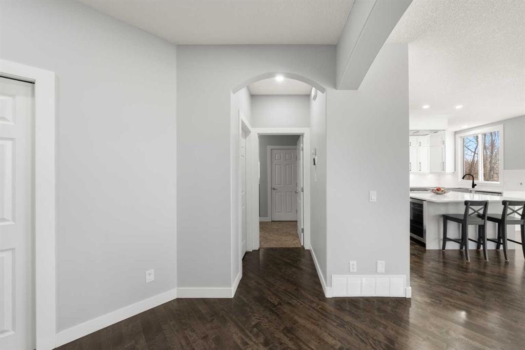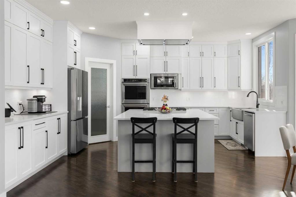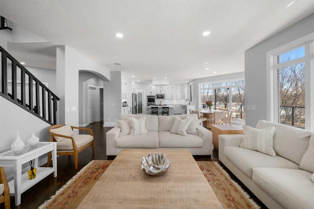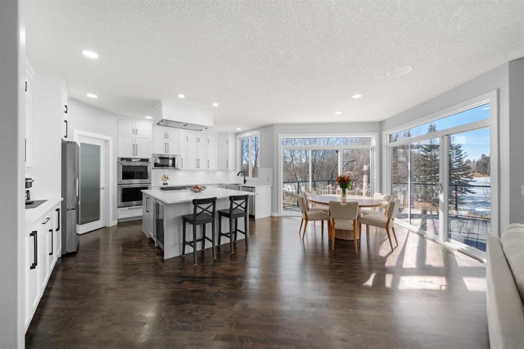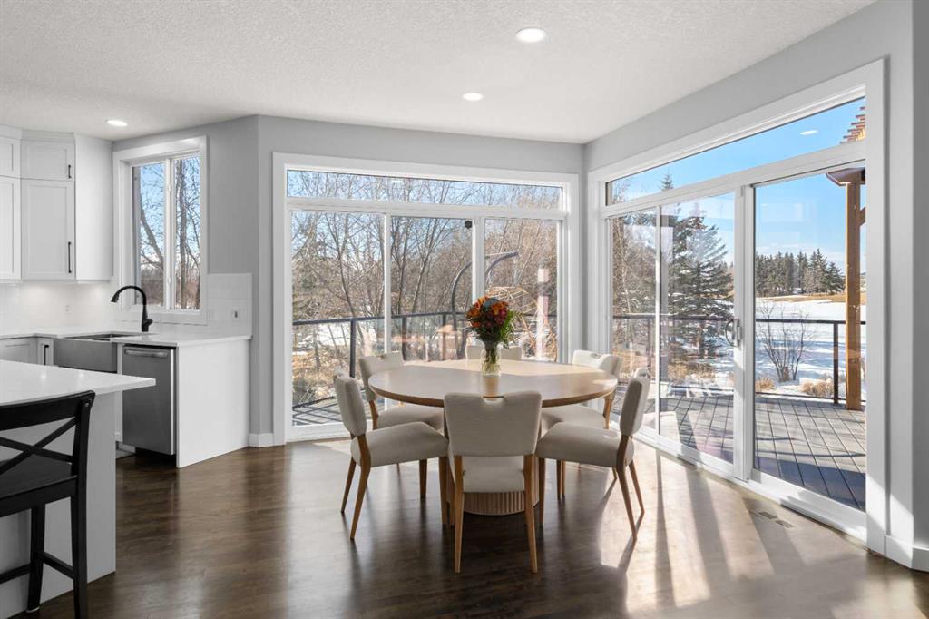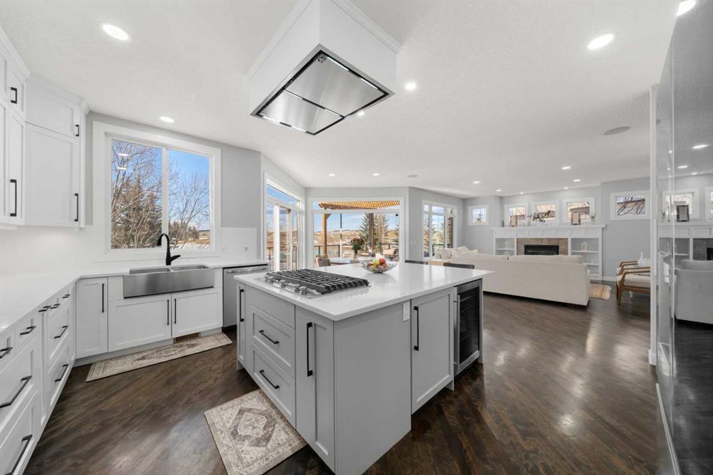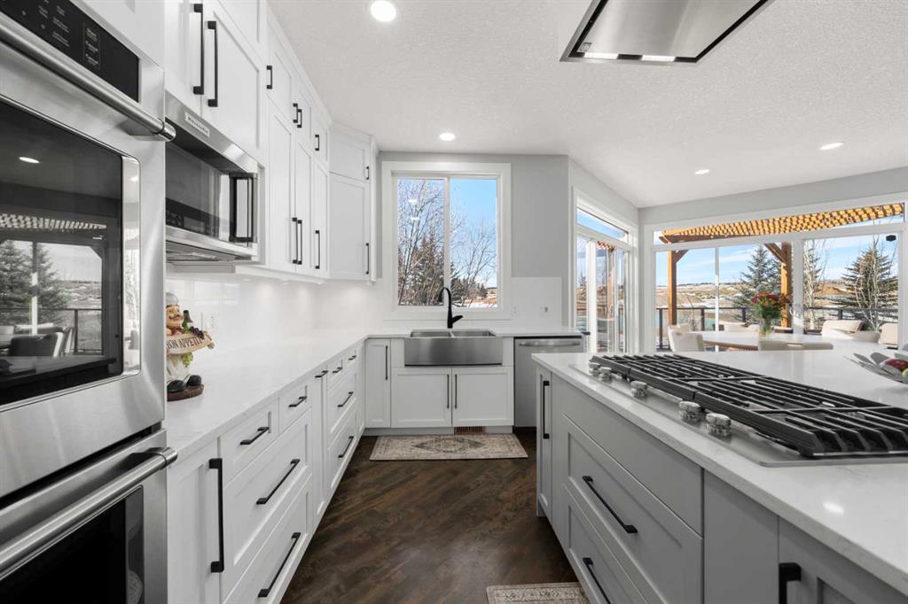 The stunning renovated main floor showcases a showpiece kitchen with full-height white cabinetry, a massive island, 5-burner gas cooktop, double wall oven, smart fridge, quartz counters and walkthrough pantry. The expansive dining area is wrapped in natural light, with double patio doors opening onto the large west-facing deck complete with gazebo—perfect for alfresco dining while taking in unforgettable sunsets over the mountains. The inviting living room features gleaming hardwood floors and a beautiful fireplace. A private main floor office/den with built-in credenza offers the ideal work-from-home space. Completing this level is a well-designed mudroom/laundry room with sink and a stylish powder room.