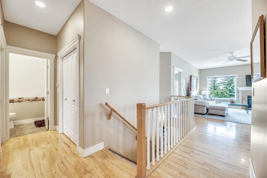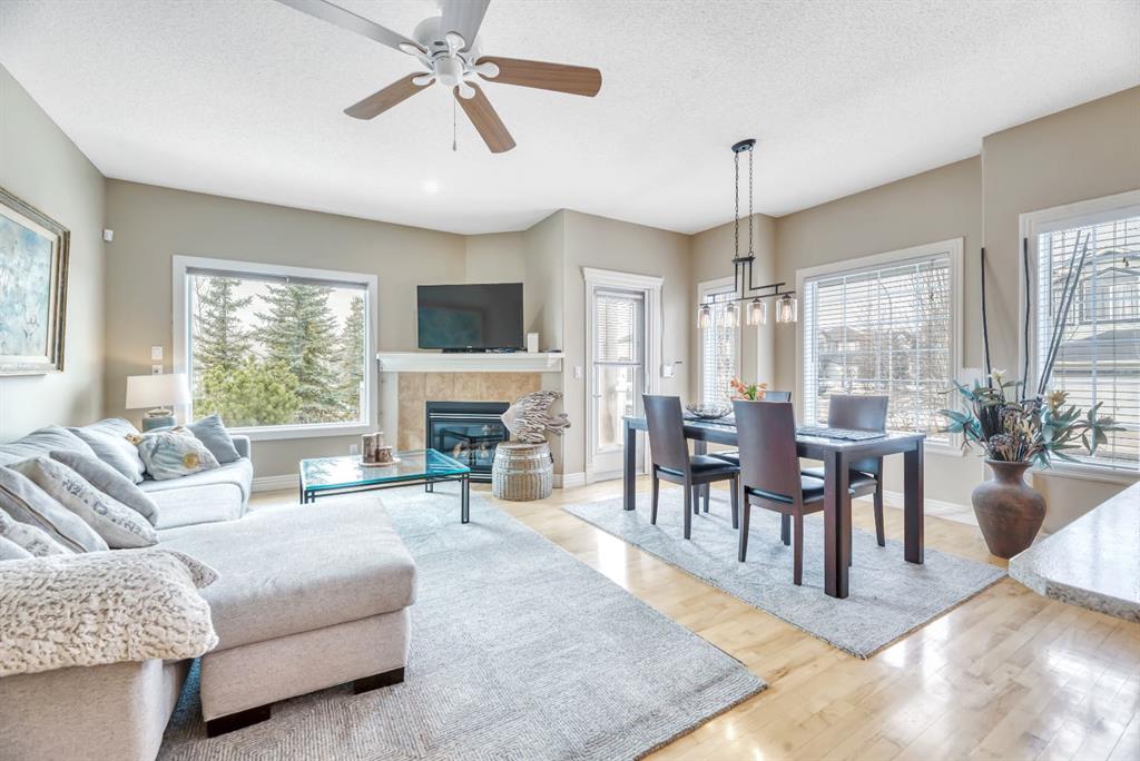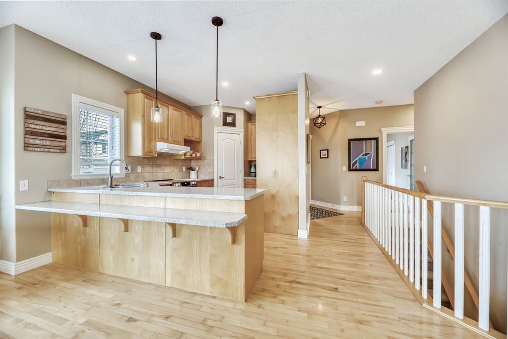 The main floor features an inviting open-concept layout with maple hardwood flooring, a bright and functional kitchen with ample cabinetry and counter space, a corner pantry, glass accents, and a peninsula island with breakfast bar—perfect for casual dining or entertaining. The kitchen flows into the spacious living and dining areas, highlighted by a cozy gas fireplace and large windows that capture the serene views. Step out onto the west-facing deck to enjoy your private backyard and the peaceful green space beyond.