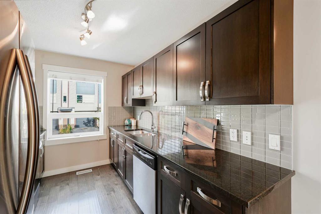 The main level features contemporary finishes throughout — including smoke grey engineered laminate flooring, granite countertops, glass tile backsplash, dark cabinetry, stainless steel appliances, and high-profile baseboards. The galley-style kitchen flows into a cozy dining nook and a bright, west-facing living room. Step out onto your private west-facing balcony, perfect for evening sunsets and entertaining.