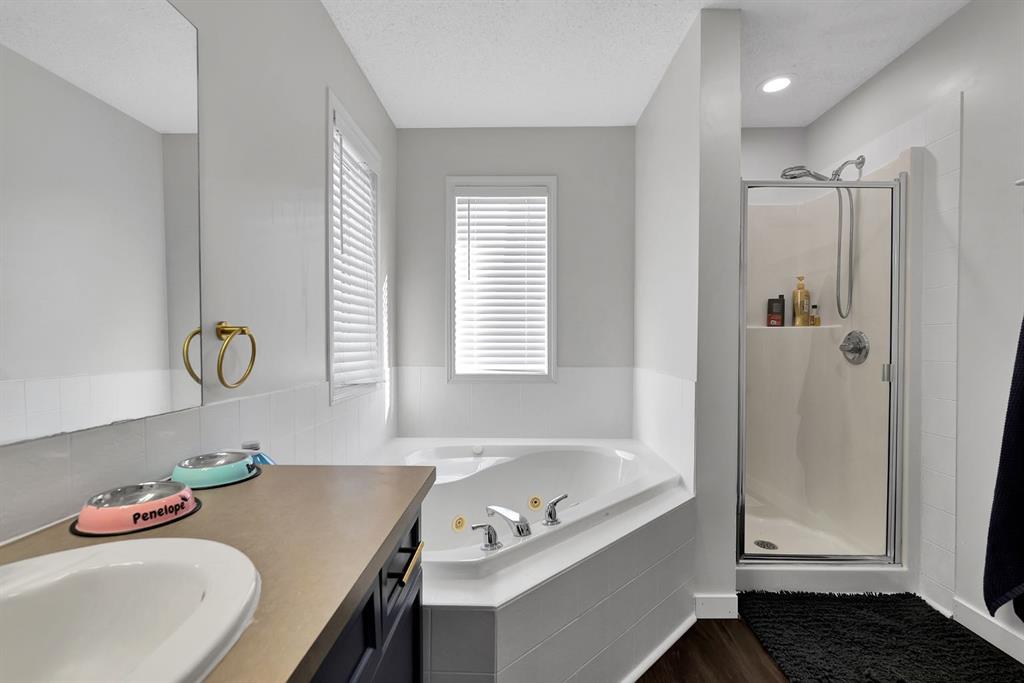Upstairs you will find three bedrooms, including a generous primary suite with walk in closet and full ensuite featuring a corner two person jetted tub and separate shower. Two additional bedrooms are connected by a Jack and Jill full bathroom, and the upper level laundry adds convenience.