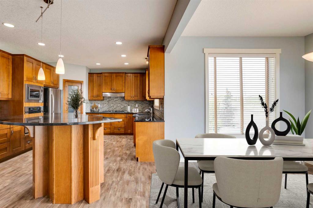 The thoughtfully designed main floor offers a large flex room—perfect for a formal dining area or a home office—along with an exceptional mudroom off the garage featuring main-floor laundry and a built-in folding table for everyday convenience. The heart of the home is the beautifully appointed kitchen, showcasing an oversized island, mosaic tile backsplash, granite countertops, full-height cabinetry, pot lighting, and stainless steel appliances including a gas cooktop, built-in wall oven, and microwave. The adjacent dining area comfortably accommodates family gatherings and entertaining, with direct access to the walkout deck—ideal for indoor-outdoor living.