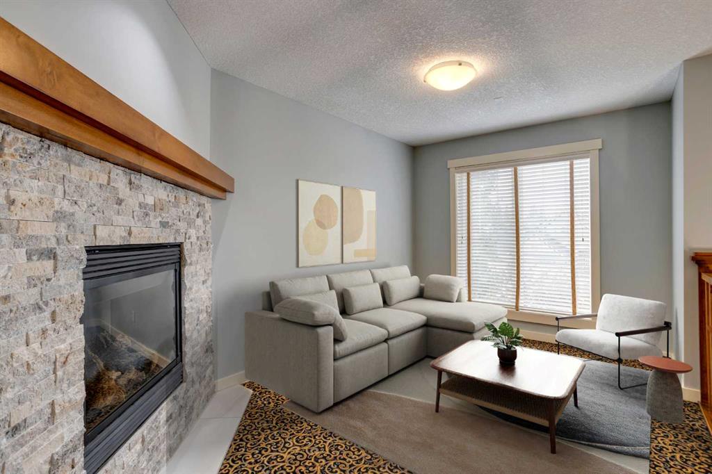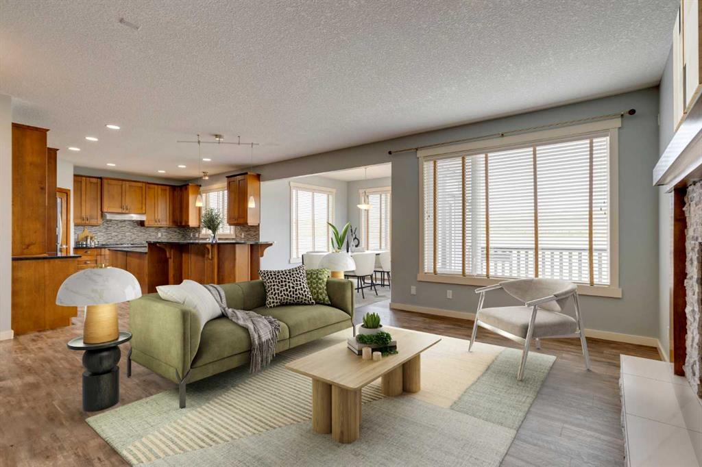 The spacious living room is warm and inviting, anchored by a striking stone feature fireplace and seamlessly open to the kitchen and dining areas.
