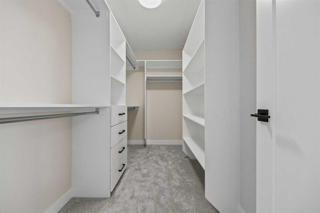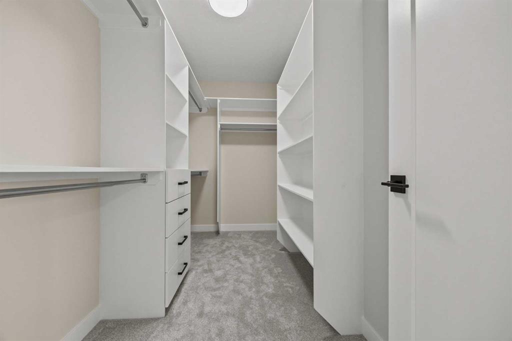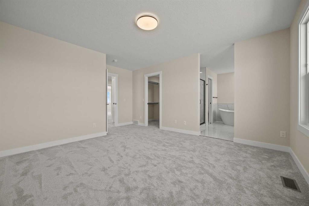 Upstairs, the oversized grand staircase with white railings and matte black iron spindles leads you to the luxurious primary bedroom. This bedroom offers a spa-like 5-piece ensuite with a freestanding tub, fully tiled walk-in shower, dual vanities, and an enclosed toilet. The primary bedroom also includes a custom walk-in closet with built-in shelving and organizers, plus stunning sunrise views to start your mornings. Two additional spacious bedrooms and a full bathroom provide plenty of room for family, while the tiled laundry room—complete with a quartz countertop for folding and storage—adds everyday convenience.