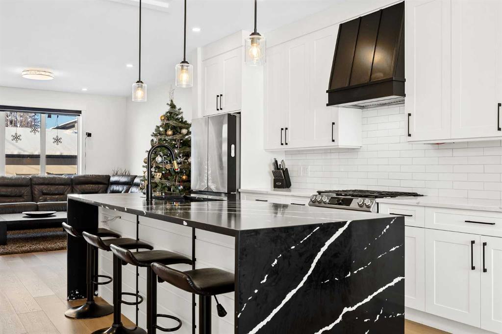 Step inside to a thoughtfully designed layout with 9’ ceilings on all levels, hardwood flooring, and a kitchen that truly stands out. Sleek black finishes, a striking waterfall-style quartz island, and quartz counters in every bathroom give the home a clean, modern feel. The main floor also features a spacious living room with a fireplace, a dedicated dining area, a convenient mudroom, and a 2-piece bath.